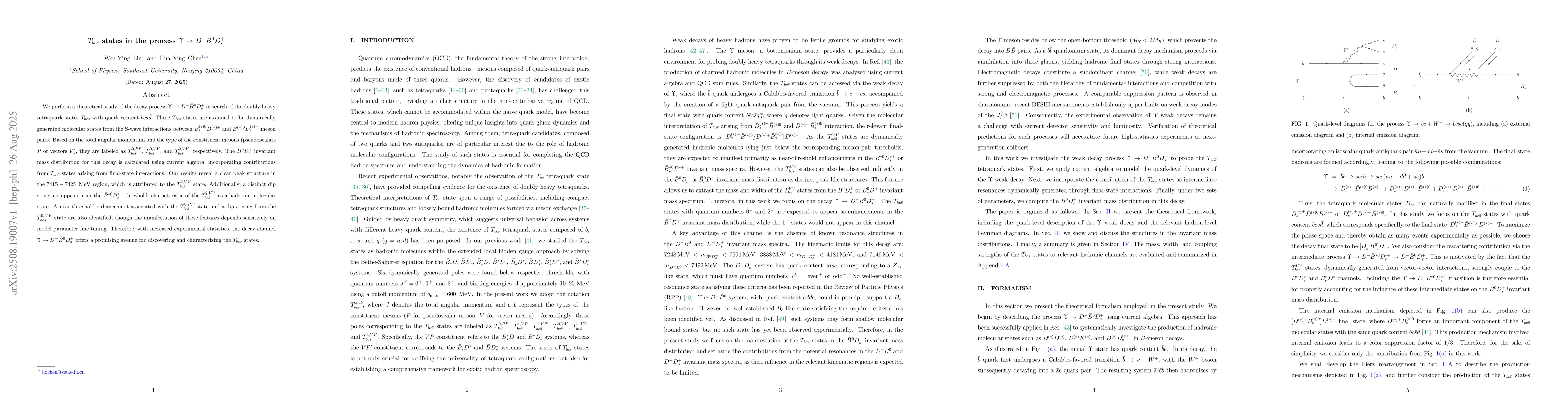 We perform a theoretical study of the decay process $\Upsilon \to D^{-} \bar{B}^{0} D_s^{+}$ in search of the doubly heavy tetraquark states $T_{bc\bar{s}}$ with quark content $bc\bar{s}\bar{d}$. These $T_{bc\bar{s}}$ states are assumed to be dynamically generated molecular states from the S-wave interactions between $\bar{B}_s^{(*)0} D^{(*)+}$ and $\bar{B}^{(*)0} D_s^{(*)+}$ meson pairs. Based on the total angular momentum and the type of the constituent mesons (pseudoscalars $P$ or vectors $V$), they are labeled as $T_{bc\bar{s}}^{0, PP}$, $T_{bc\bar{s}}^{0, VV}$, and $T_{bc\bar{s}}^{2, VV}$, respectively. The $\bar{B}^{0} D_s^{+}$ invariant mass distribution for this decay is calculated using current algebra, incorporating contributions from $T_{bc\bar{s}}$ states arising from final-state interactions. Our results reveal a clear peak structure in the $7415 - 7425$ MeV region, which is attributed to the $T_{bc\bar{s}}^{2, VV}$ state. Additionally, a distinct dip structure appears near the $\bar{B}^{*0} D_s^{*+}$ threshold, characteristic of the $T_{bc\bar{s}}^{2, VV}$ as a hadronic molecular state. A near-threshold enhancement associated with the $T_{bc\bar{s}}^{0, PP}$ state and a dip arising from the $T_{bc\bar{s}}^{0,\,VV}$ state are also identified, though the manifestation of these features depends sensitively on model parameter fine-tuning. Therefore, with increased experimental statistics, the decay channel $\Upsilon \to D^{-} \bar{B}^{0} D_s^{+}$ offers a promising avenue for discovering and characterizing the $T_{bc\bar{s}}$ states.