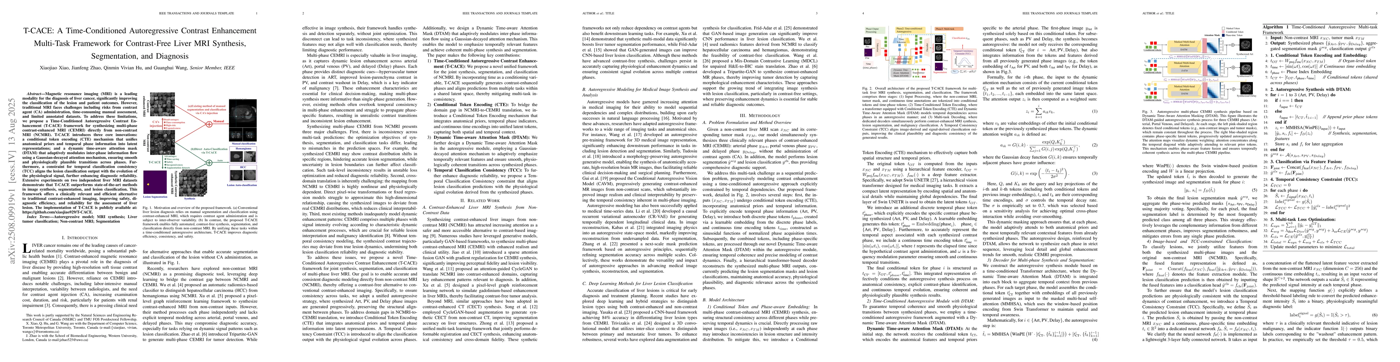 Magnetic resonance imaging (MRI) is a leading modality for the diagnosis of liver cancer, significantly improving the classification of the lesion and patient outcomes. However, traditional MRI faces challenges including risks from contrast agent (CA) administration, time-consuming manual assessment, and limited annotated datasets. To address these limitations, we propose a Time-Conditioned Autoregressive Contrast Enhancement (T-CACE) framework for synthesizing multi-phase contrast-enhanced MRI (CEMRI) directly from non-contrast MRI (NCMRI). T-CACE introduces three core innovations: a conditional token encoding (CTE) mechanism that unifies anatomical priors and temporal phase information into latent representations; and a dynamic time-aware attention mask (DTAM) that adaptively modulates inter-phase information flow using a Gaussian-decayed attention mechanism, ensuring smooth and physiologically plausible transitions across phases. Furthermore, a constraint for temporal classification consistency (TCC) aligns the lesion classification output with the evolution of the physiological signal, further enhancing diagnostic reliability. Extensive experiments on two independent liver MRI datasets demonstrate that T-CACE outperforms state-of-the-art methods in image synthesis, segmentation, and lesion classification. This framework offers a clinically relevant and efficient alternative to traditional contrast-enhanced imaging, improving safety, diagnostic efficiency, and reliability for the assessment of liver lesion. The implementation of T-CACE is publicly available at: https://github.com/xiaojiao929/T-CACE.
