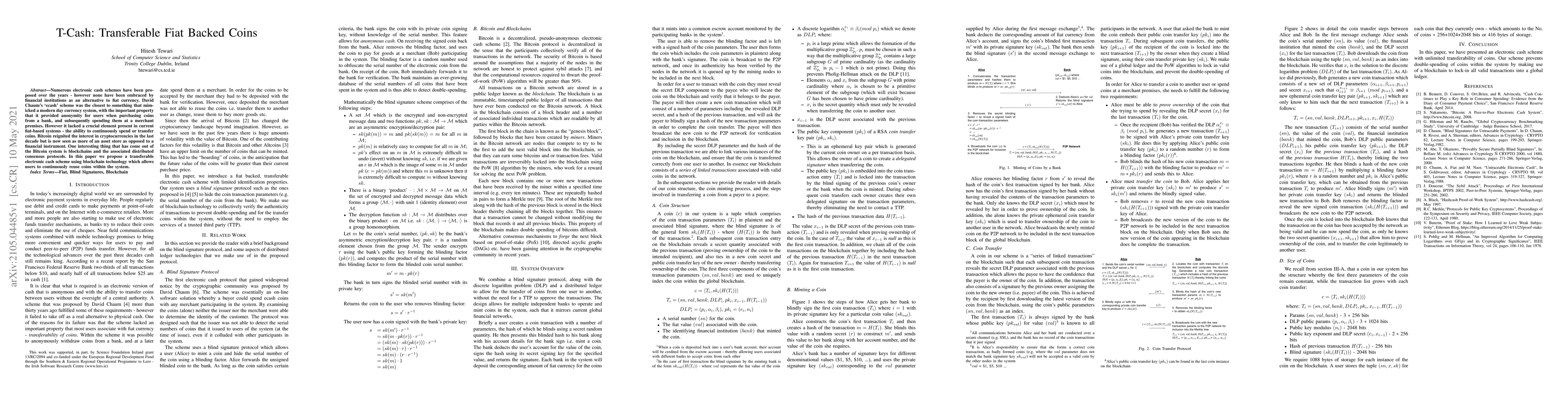 This paper proposes T-Cash, an electronic cash scheme utilizing blockchain technology, enabling continuous reuse of coins, unlike previous schemes. It aims to bridge the gap between anonymity provided by Chaum's ecash and the transferability of fiat currency.