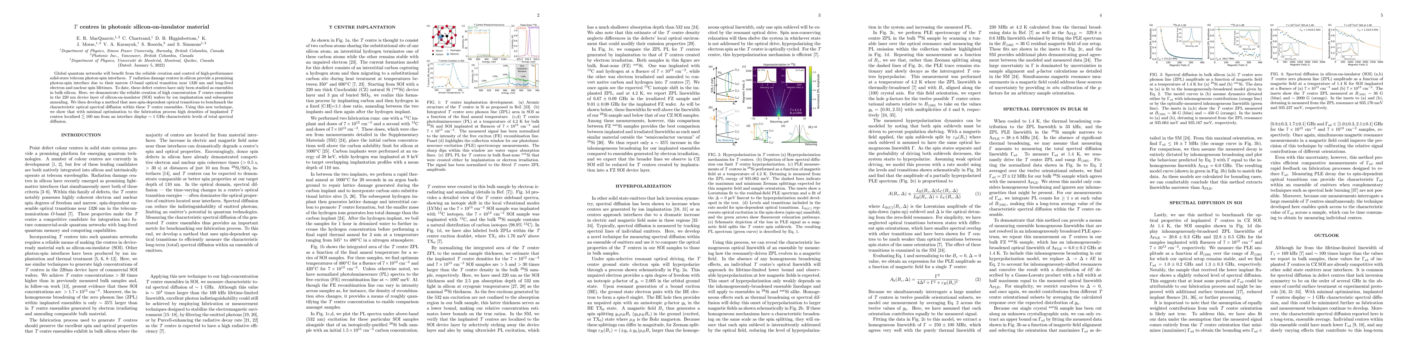 This paper demonstrates the creation of high-concentration T centre ensembles in silicon-on-insulator (SOI) material via ion implantation and annealing, showcasing their potential for solid-state telecom photon-spin interfaces. The study also develops a new method to benchmark the optical spectral diffusion of these centres, revealing promising ~1 GHz diffusion levels with minimal fabrication optimization.