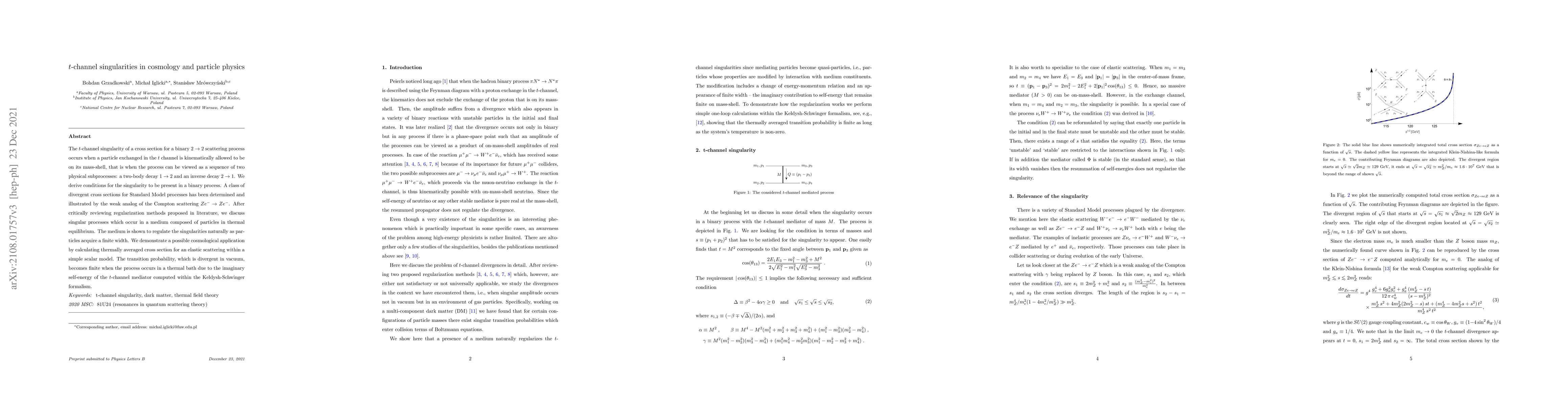 This paper explores $t$-channel singularities in particle physics and cosmology, deriving conditions for their occurrence in binary processes and reviewing regularization methods. It demonstrates how thermal medium naturally regulates these singularities, providing a cosmological application by showing how thermal averaging renders divergent cross sections finite.