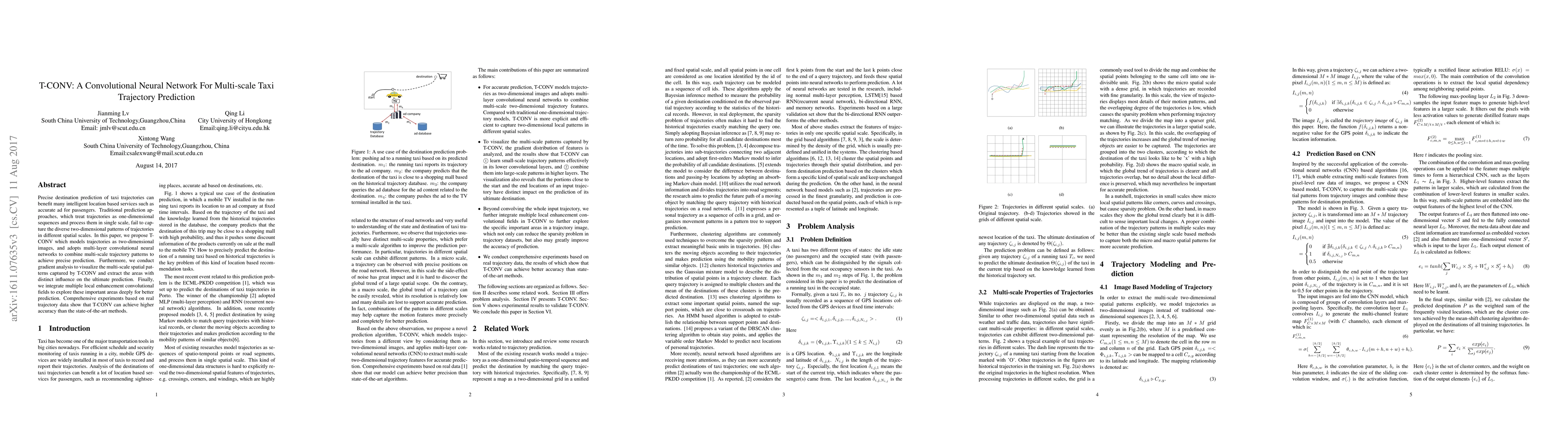 T-CONV is a convolutional neural network designed to predict taxi trajectories by modeling them as two-dimensional images, leveraging multi-layer convolutions to capture multi-scale spatial patterns for precise destination prediction. Experiments demonstrate its superior accuracy compared to existing methods.