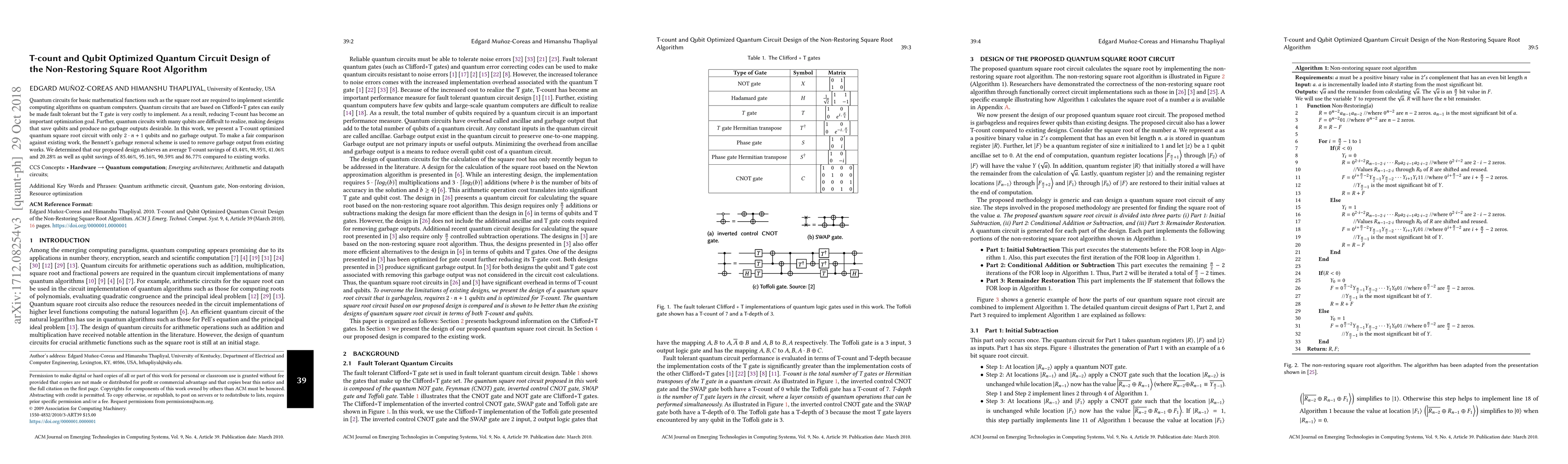 Quantum circuits for basic mathematical functions such as the square root are required to implement scientific computing algorithms on quantum computers. Quantum circuits that are based on Clifford+T gates can easily be made fault tolerant but the T gate is very costly to implement. As a result, reducing T-count has become an important optimization goal. Further, quantum circuits with many qubits are difficult to realize, making designs that save qubits and produce no garbage outputs desirable. In this work, we present a T-count optimized quantum square root circuit with only $2 \cdot n +1$ qubits and no garbage output. To make a fair comparison against existing work, the Bennett's garbage removal scheme is used to remove garbage output from existing works. We determined that our proposed design achieves an average T-count savings of $43.44 \%$, $98.95 \%$, $41.06 \%$ and $20.28 \%$ as well as qubit savings of $85.46 \%$, $95.16 \%$, $90.59 \%$ and $86.77 \%$ compared to existing works.