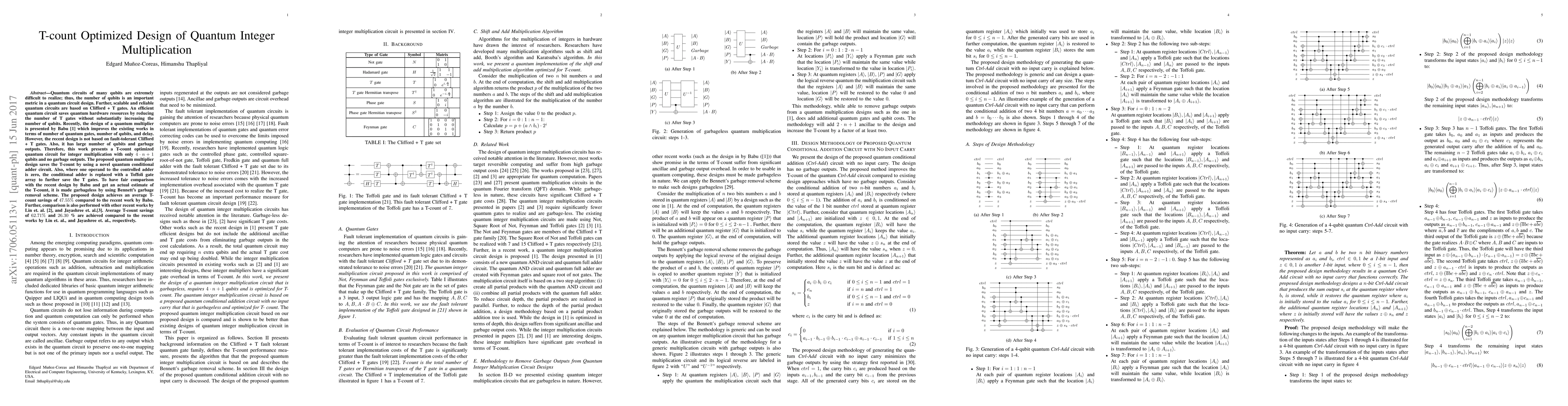 Quantum circuits of many qubits are extremely difficult to realize; thus, the number of qubits is an important metric in a quantum circuit design. Further, scalable and reliable quantum circuits are based on Clifford + T gates. An efficient quantum circuit saves quantum hardware resources by reducing the number of T gates without substantially increasing the number of qubits. Recently, the design of a quantum multiplier is presented by Babu [1] which improves the existing works in terms of number of quantum gates, number of qubits, and delay. However, the recent design is not based on fault-tolerant Clifford + T gates. Also, it has large number of qubits and garbage outputs. Therefore, this work presents a T-count optimized quantum circuit for integer multiplication with only $4 \cdot n + 1$ qubits and no garbage outputs. The proposed quantum multiplier design saves the T-count by using a novel quantum conditional adder circuit. Also, where one operand to the controlled adder is zero, the conditional adder is replaced with a Toffoli gate array to further save the T gates. To have fair comparison with the recent design by Babu and get an actual estimate of the T-count, it is made garbageless by using Bennett's garbage removal scheme. The proposed design achieves an average T-count savings of $47.55\%$ compared to the recent work by Babu. Further, comparison is also performed with other recent works by Lin et. al. [2], and Jayashree et. al.[3]. Average T-count savings of $62.71\%$ and $26.30\%$ are achieved compared to the recent works by Lin et. al., and Jayashree et. al., respectively.