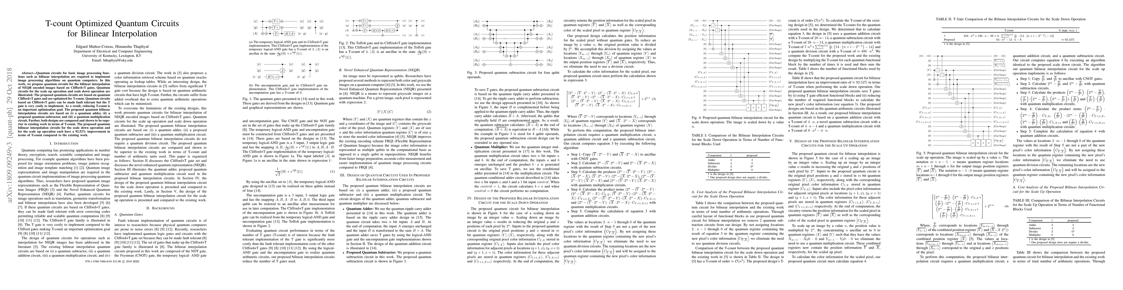 This paper proposes optimized quantum circuits for bilinear interpolation using Clifford+T gates, significantly reducing T-count by 92.52% compared to existing methods. The circuits utilize a quantum adder, a novel quantum subtractor, and a quantum multiplication circuit for efficient scaling operations.