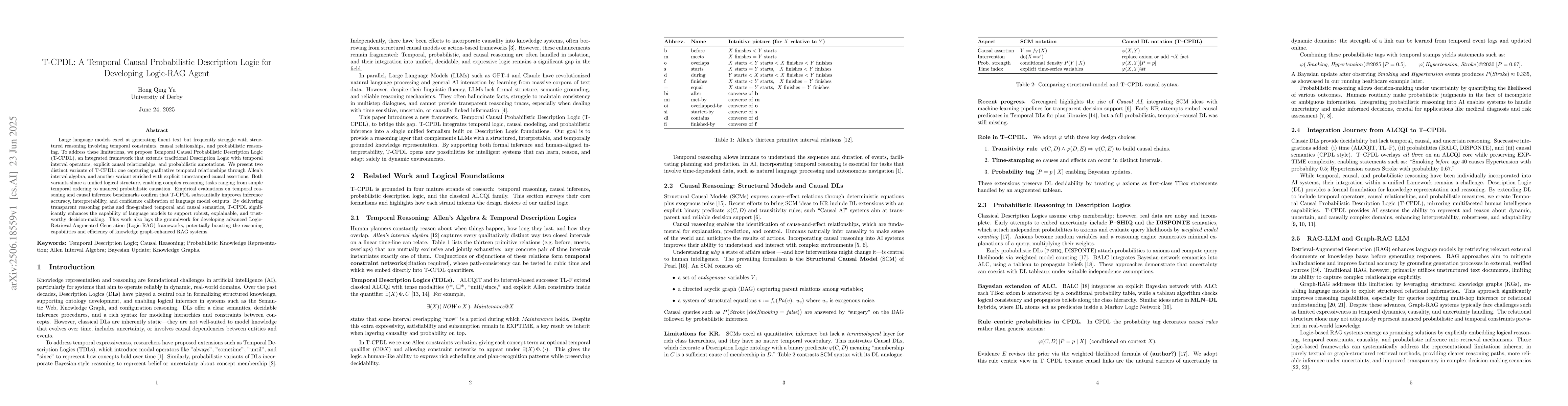 Large language models excel at generating fluent text but frequently struggle with structured reasoning involving temporal constraints, causal relationships, and probabilistic reasoning. To address these limitations, we propose Temporal Causal Probabilistic Description Logic (T-CPDL), an integrated framework that extends traditional Description Logic with temporal interval operators, explicit causal relationships, and probabilistic annotations. We present two distinct variants of T-CPDL: one capturing qualitative temporal relationships through Allen's interval algebra, and another variant enriched with explicit timestamped causal assertions. Both variants share a unified logical structure, enabling complex reasoning tasks ranging from simple temporal ordering to nuanced probabilistic causation. Empirical evaluations on temporal reasoning and causal inference benchmarks confirm that T-CPDL substantially improves inference accuracy, interpretability, and confidence calibration of language model outputs. By delivering transparent reasoning paths and fine-grained temporal and causal semantics, T-CPDL significantly enhances the capability of language models to support robust, explainable, and trustworthy decision-making. This work also lays the groundwork for developing advanced Logic-Retrieval-Augmented Generation (Logic-RAG) frameworks, potentially boosting the reasoning capabilities and efficiency of knowledge graph-enhanced RAG systems.