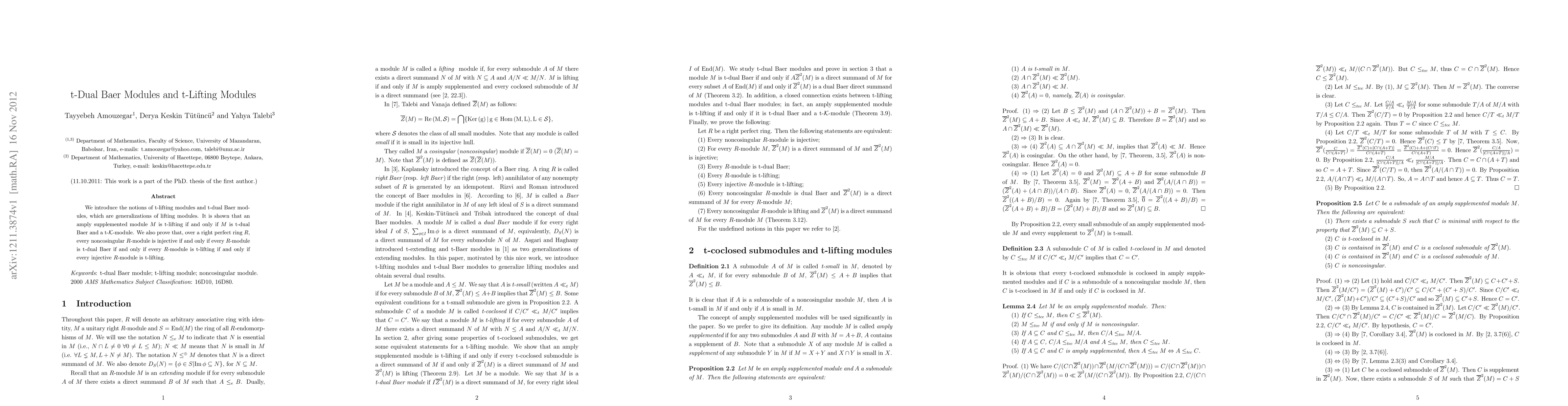 This paper introduces t-lifting modules and t-dual Baer modules as generalizations of lifting modules, proving that an amply supplemented module is t-lifting if it is also t-dual Baer and a t-$\mathcal{K}$-module. It further establishes that, over a right perfect ring, noncosingular modules are injective if and only if all modules are t-dual Baer, t-lifting, or if all injective modules are t-lifting.