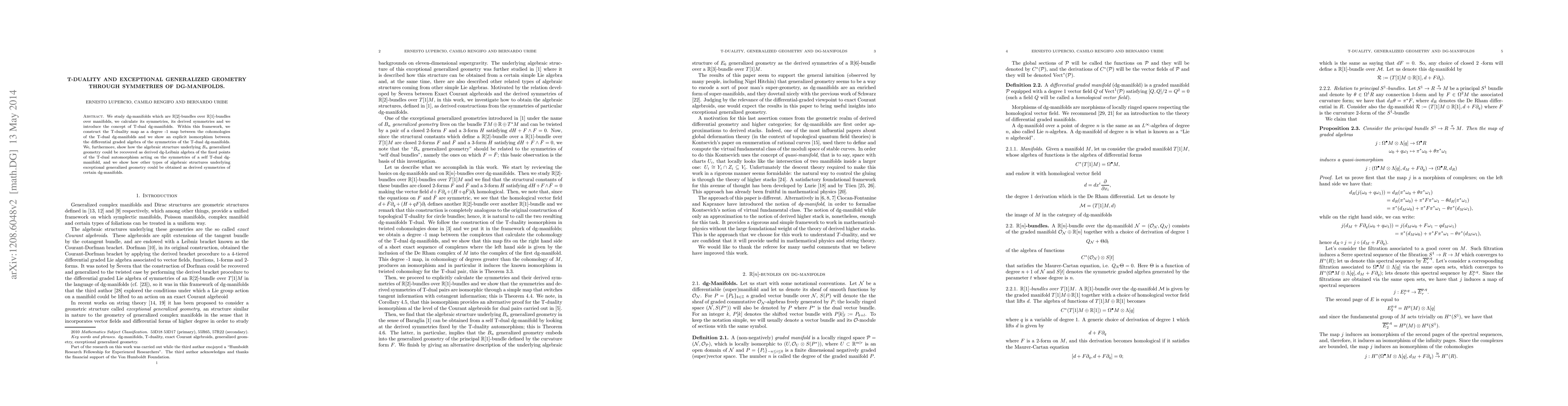This paper explores dg-manifolds structured as R[2]-bundles over R[1]-bundles, analyzing their symmetries and derived symmetries. It introduces T-dual dg-manifolds and constructs a T-duality map, showing an isomorphism between the differential graded algebras of their symmetries, and demonstrates how exceptional generalized geometry can be derived from the fixed points of T-dual automorphisms.