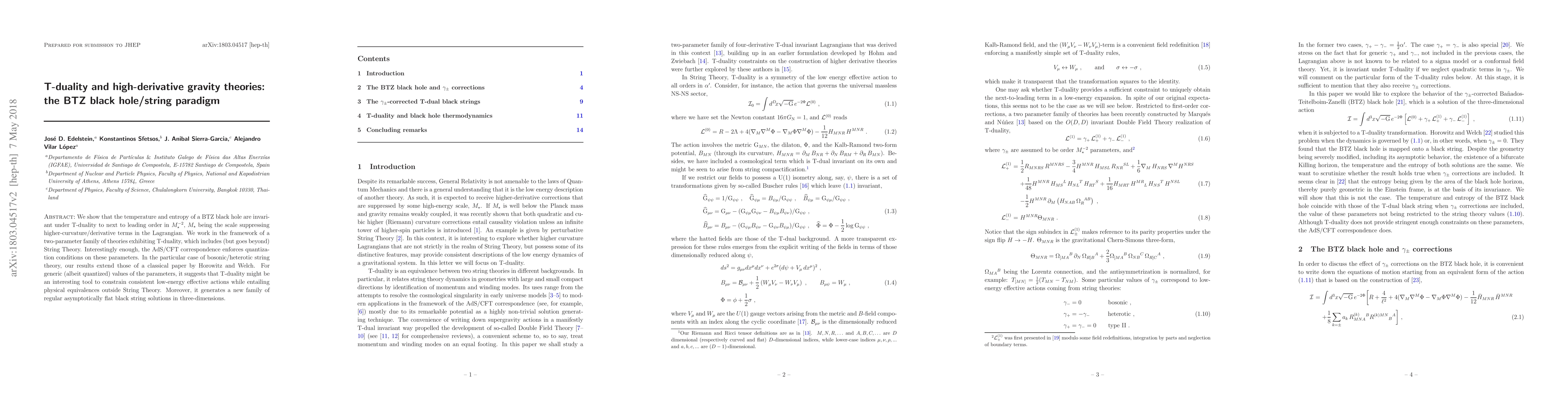 This paper demonstrates that T-duality preserves the temperature and entropy of BTZ black holes up to next to leading order in $M_\star^{-2}$, suggesting its utility in constraining low-energy effective actions beyond String Theory. It also introduces a new family of regular black string solutions in three dimensions.