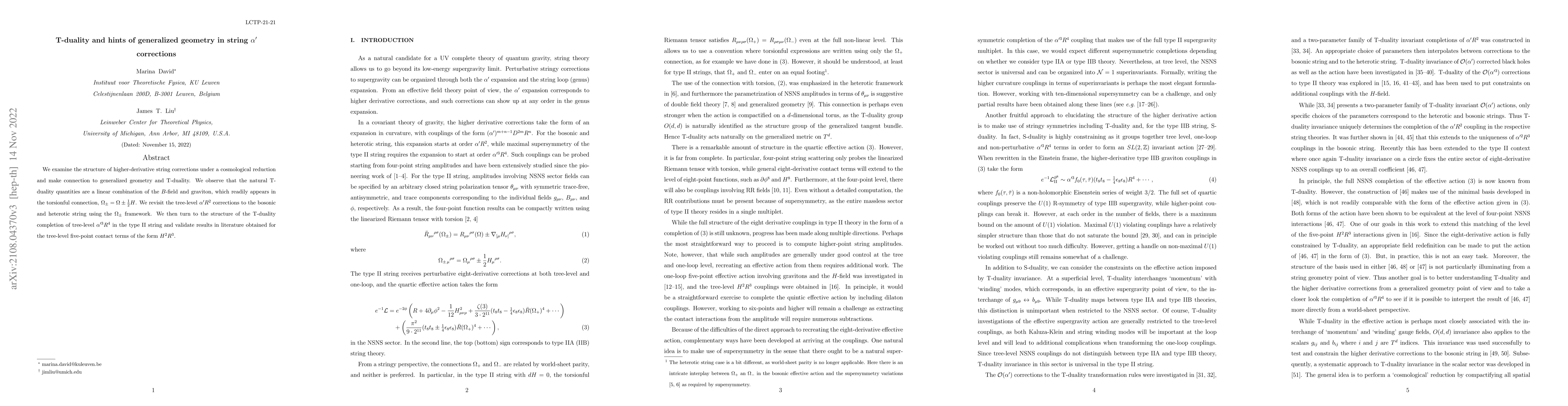 This paper explores the role of higher-derivative string $\alpha'$ corrections in cosmological reductions, linking them to generalized geometry and T-duality. It finds that while the curvature of the generalized connection with torsion is crucial, it alone is insufficient; additional $H$-field couplings are necessary to fully restore T-duality invariance.