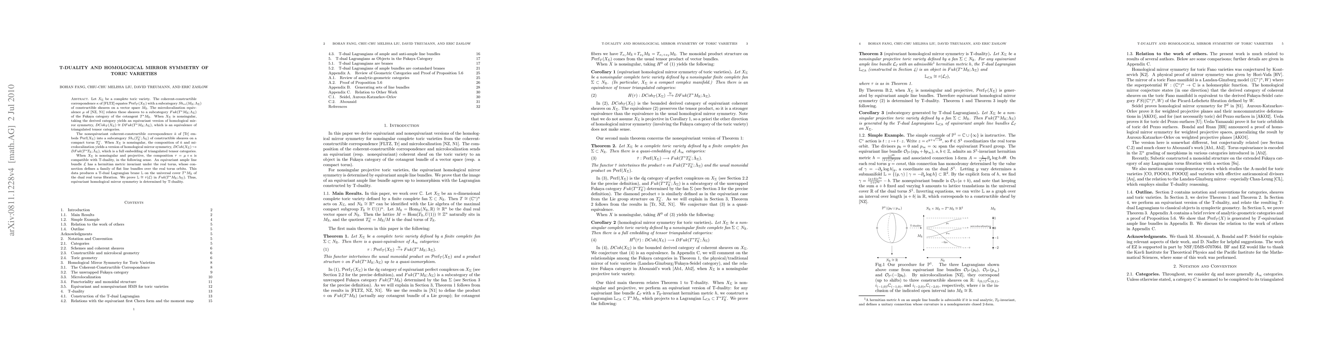 This paper explores the relationship between T-duality and homological mirror symmetry for toric varieties. It establishes an equivalence between the derived category of coherent sheaves on a toric variety and the Fukaya category of its dual, showing that equivariant homological mirror symmetry aligns with T-duality.