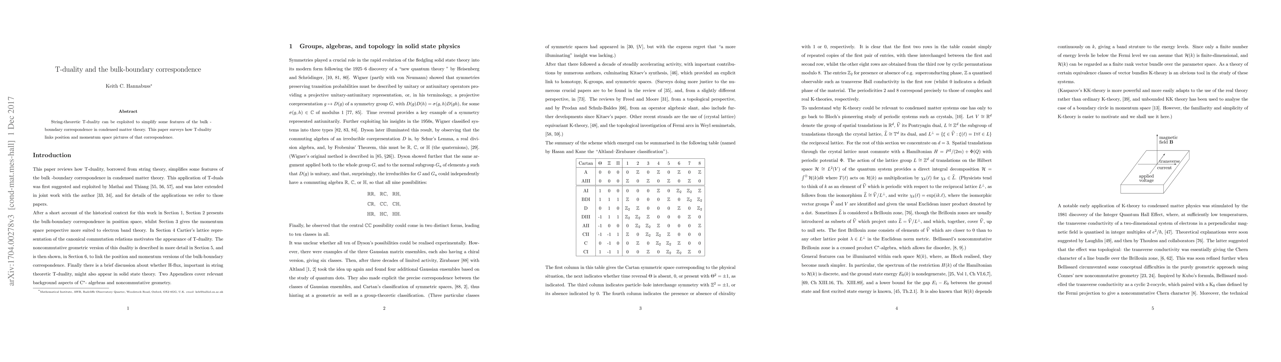 String-theoretic T-duality can be exploited to simplify some features of the bulk-boundary correspondence in condensed matter theory. This paper surveys how T-duality links position and momentum space pictures of that correspondence.