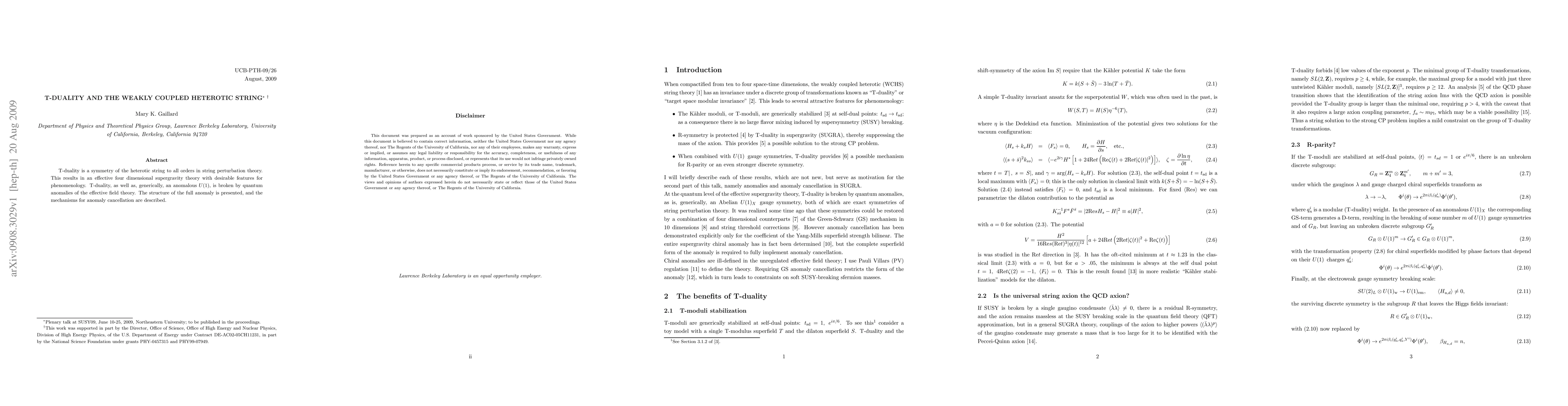 T-duality is a symmetry of the heterotic string to all orders in string perturbation theory. This results in an effective four dimensional supergravity theory with desirable features for phenomenology. T-duality, as well as, generically, an anomalous U(1), is broken by quantum anomalies of the effective field theory. The structure of the full anomaly is presented, and the mechanisms for anomaly cancellation are described.
