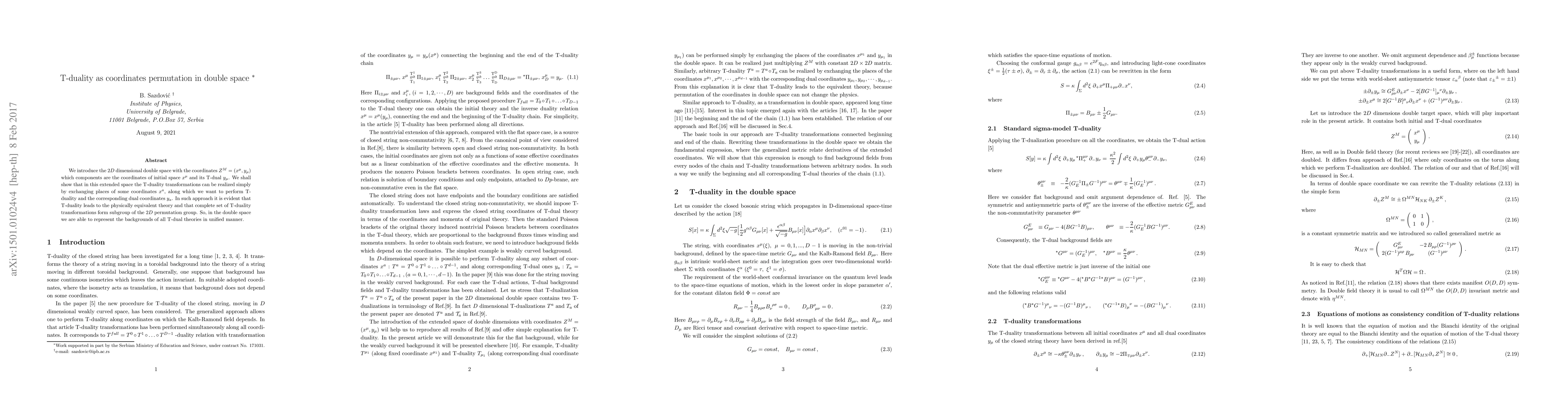This paper introduces a $2D$ double space with coordinates $Z^M=(x^\mu, y_\mu)$ to demonstrate that T-duality can be viewed as a simple permutation of coordinates in this space, revealing that T-duality transformations form a subgroup of the $2D$ permutation group, thus unifying T-dual theories.