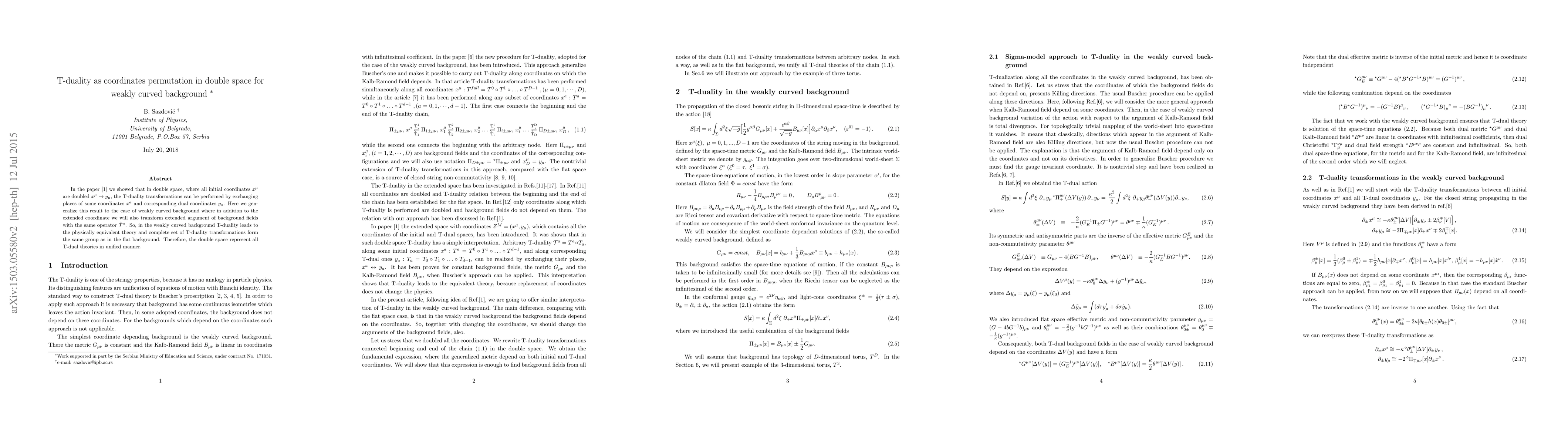 In the paper [1] we showed that in double space, where all initial coordinates $x^\mu$ are doubled $x^\mu \to y_\mu$, the T-duality transformations can be performed by exchanging places of some coordinates $x^a$ and corresponding dual coordinates $y_a$. Here we generalize this result to the case of weakly curved background where in addition to the extended coordinate we will also transform extended argument of background fields with the same operator $\hat {\cal T}^a$. So, in the weakly curved background T-duality leads to the physically equivalent theory and complete set of T-duality transformations form the same group as in the flat background. Therefore, the double space represent all T-dual theories in unified manner.