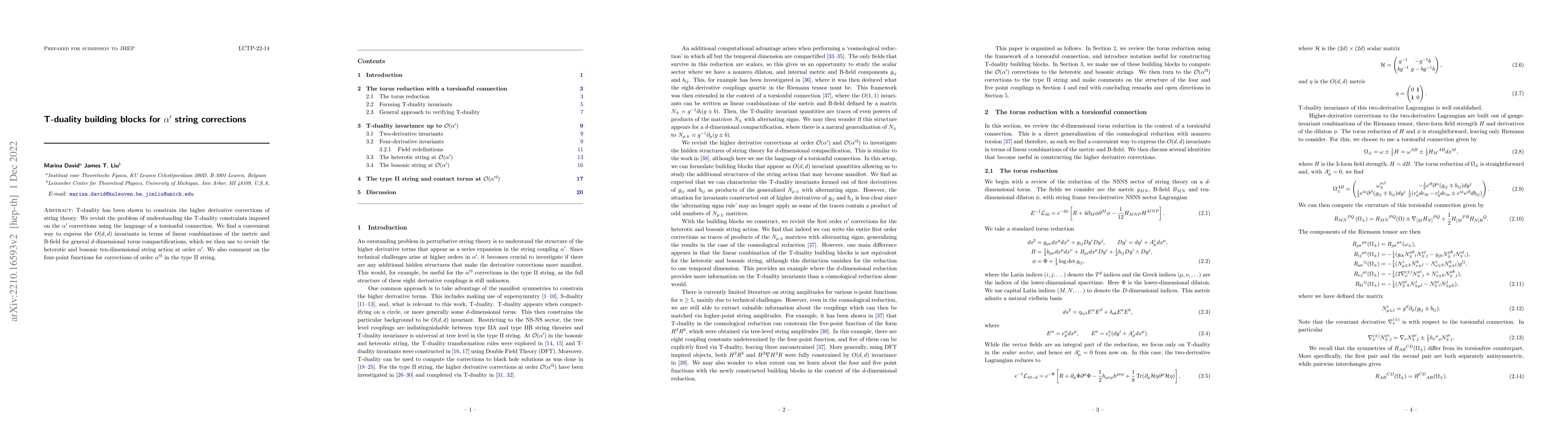 This paper explores T-duality constraints on $\alpha'$ string corrections using torsionful connections, presenting $O(d,d)$ invariants in terms of metric and B-field combinations for $d$-dimensional toroidal compactifications, and discusses implications for ten-dimensional string actions and $\alpha'^3$ corrections in type II string theory.