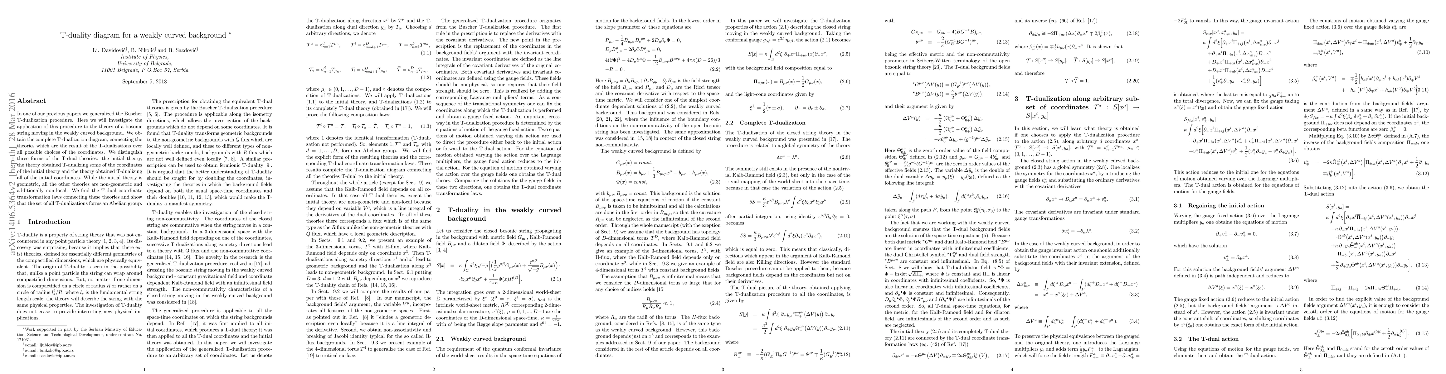 This paper generalizes Buscher's T-dualization procedure to a bosonic string in a weakly curved background, constructing a complete T-dualization diagram. It identifies three forms of T-dual theories, showing that while the initial theory is geometric, the others are non-geometric and nonlocal, and establishes that the set of T-dualizations forms an Abelian group.