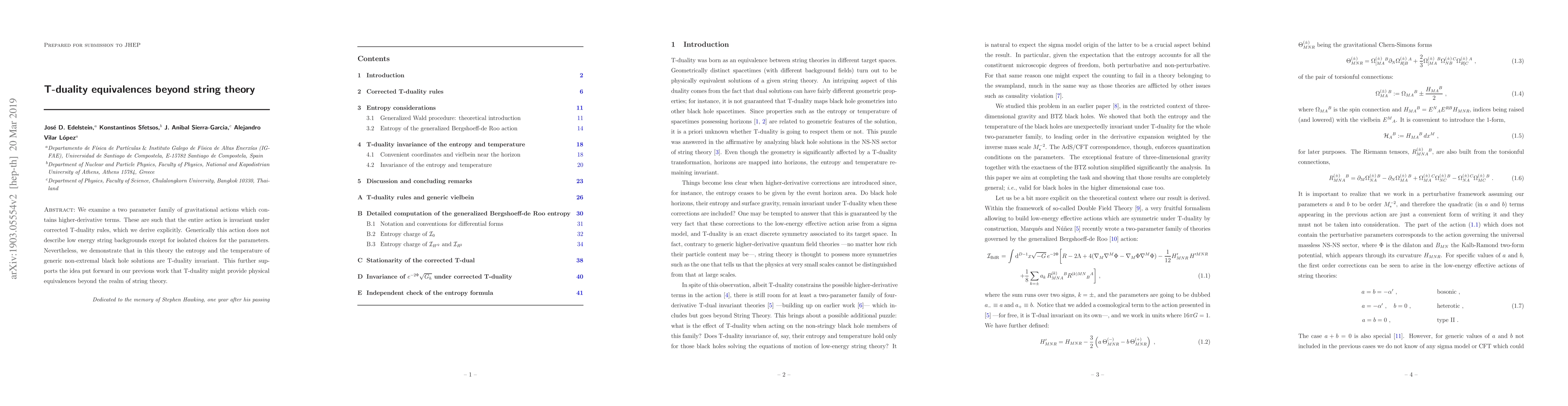This paper explores a two-parameter family of gravitational actions with higher-derivative terms, showing that they are invariant under corrected T-duality rules. It demonstrates T-duality invariance in entropy and temperature of black hole solutions, supporting the notion that T-duality may extend beyond string theory.