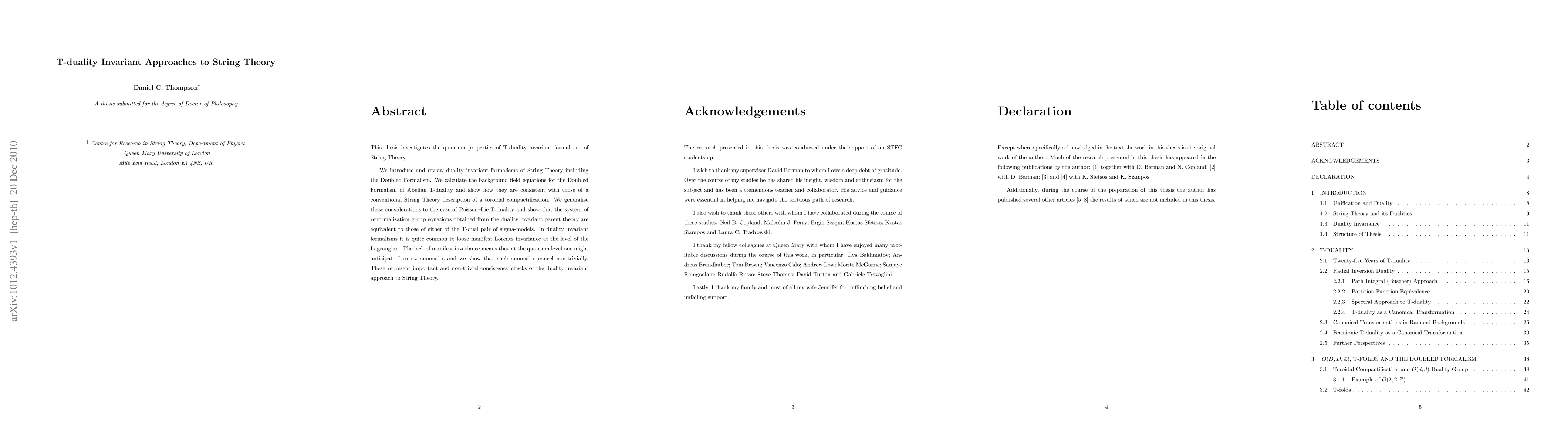 This thesis investigates the quantum properties of T-duality invariant formalisms of String Theory. We introduce and review duality invariant formalisms of String Theory including the Doubled Formalism. We calculate the background field equations for the Doubled Formalism of Abelian T-duality and show how they are consistent with those of a conventional String Theory description of a toroidal compactification. We generalise these considerations to the case of Poisson--Lie T-duality and show that the system of renormalisation group equations obtained from the duality invariant parent theory are equivalent to those of either of the T-dual pair of sigma-models. In duality invariant formalisms it is quite common to loose manifest Lorentz invariance at the level of the Lagrangian. The lack of manifest invariance means that at the quantum level one might anticipate Lorentz anomalies and we show that such anomalies cancel non-trivially. These represent important and non-trivial consistency checks of the duality invariant approach to String Theory.