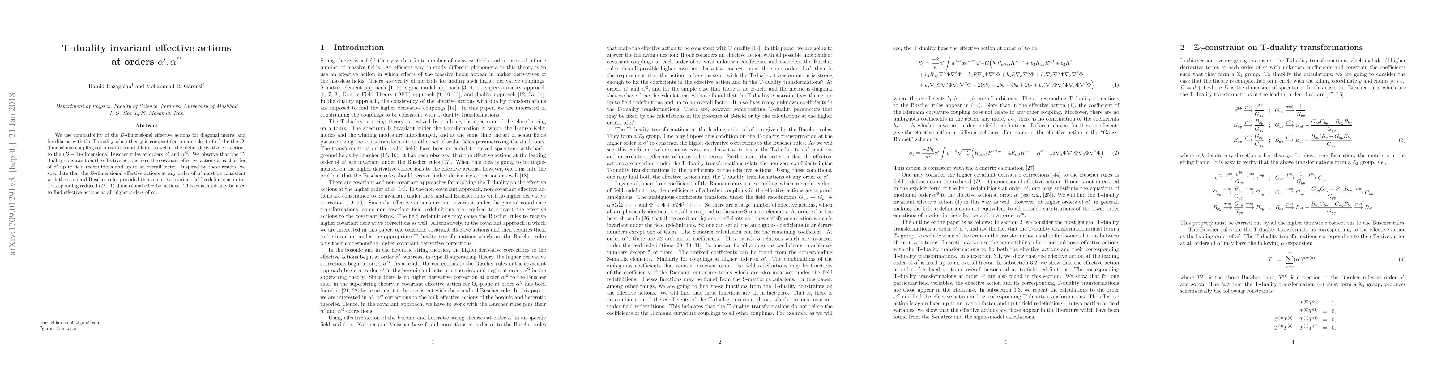 This paper investigates the compatibility of $D$-dimensional effective actions with T-duality in string theory, determining the couplings of curvatures and dilaton, and higher derivative corrections at orders $\alpha'$ and $\alpha'^2$. The findings suggest that T-duality constraints fix the effective actions up to field redefinitions, hinting at a broader consistency with the Buscher rules at all $\alpha'$ orders.