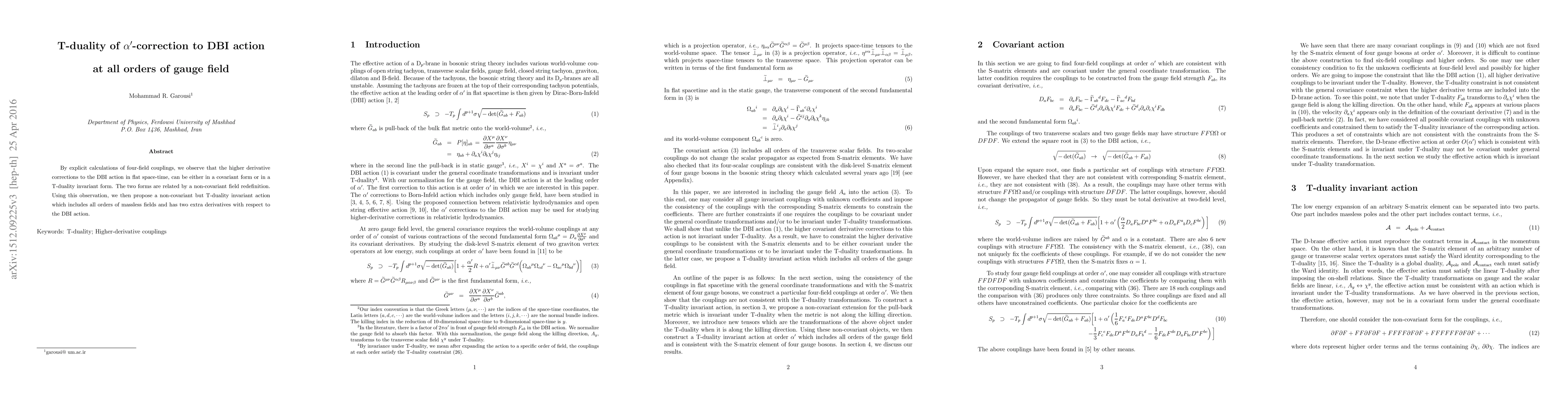 The paper demonstrates that higher-derivative corrections to the DBI action can be expressed in either a covariant or a T-duality invariant form, proposing a T-duality invariant action with two extra derivatives, related by a non-covariant field redefinition.