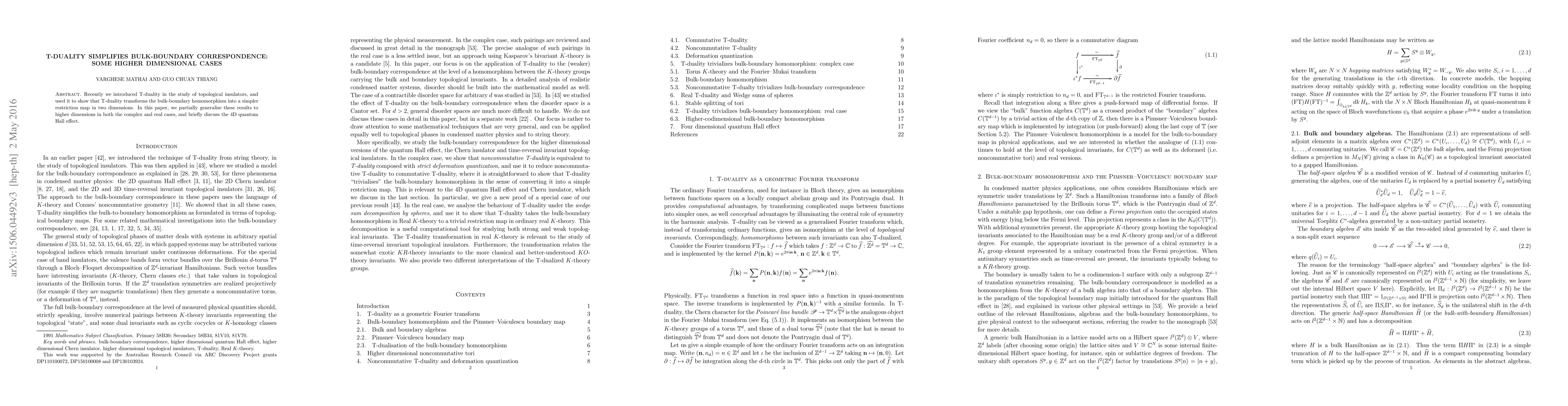 This paper extends the application of T-duality to higher dimensions, demonstrating that it simplifies the bulk-boundary correspondence in topological insulators beyond 2D, and touches on the implications for the 4D quantum Hall effect.