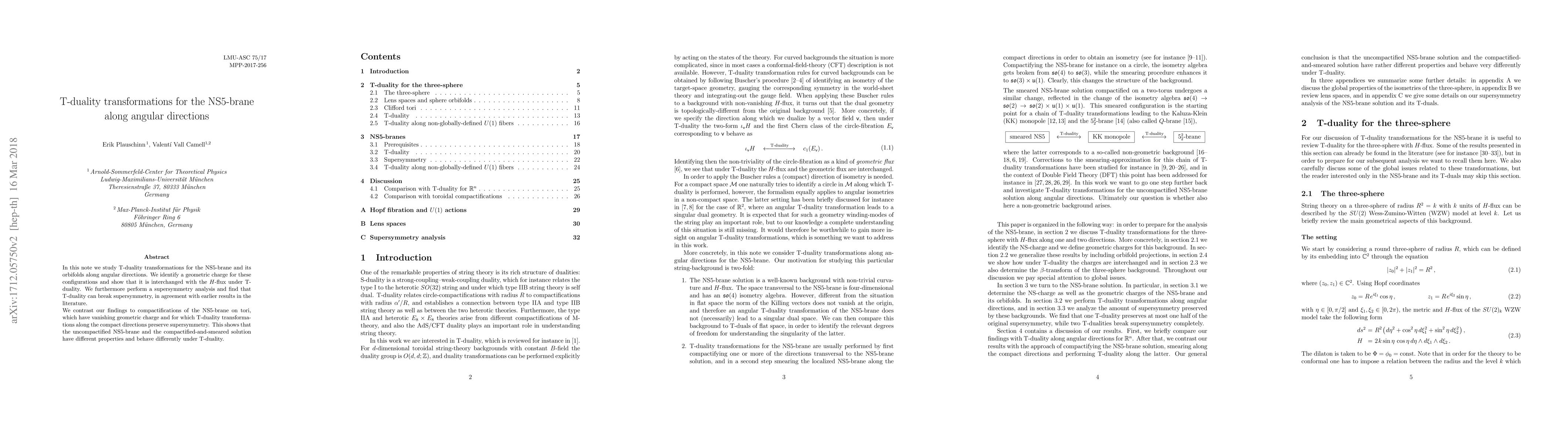This paper explores T-duality transformations for NS5-branes along angular directions, identifying a geometric charge interchanged with H-flux. Supersymmetry analysis reveals T-duality can break supersymmetry, contrasting with compactified NS5-brane solutions that preserve it under T-duality, highlighting distinct properties and behaviors of uncompactified vs. compactified-and-smeared NS5-branes.