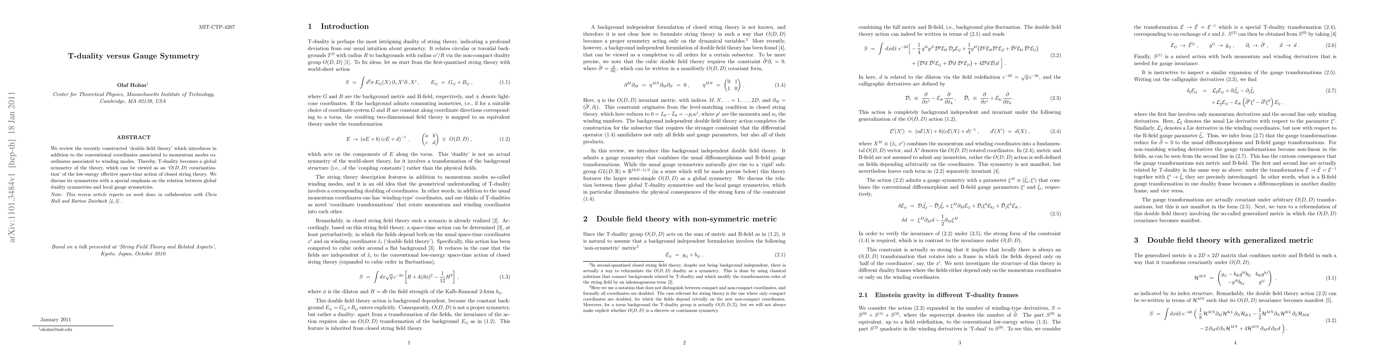 We review the recently constructed `double field theory' which introduces in addition to the conventional coordinates associated to momentum modes coordinates associated to winding modes. Thereby, T-duality becomes a global symmetry of the theory, which can be viewed as an `O(D,D) covariantization' of the low-energy effective space-time action of closed string theory. We discuss its symmetries with a special emphasis on the relation between global duality symmetries and local gauge symmetries.
