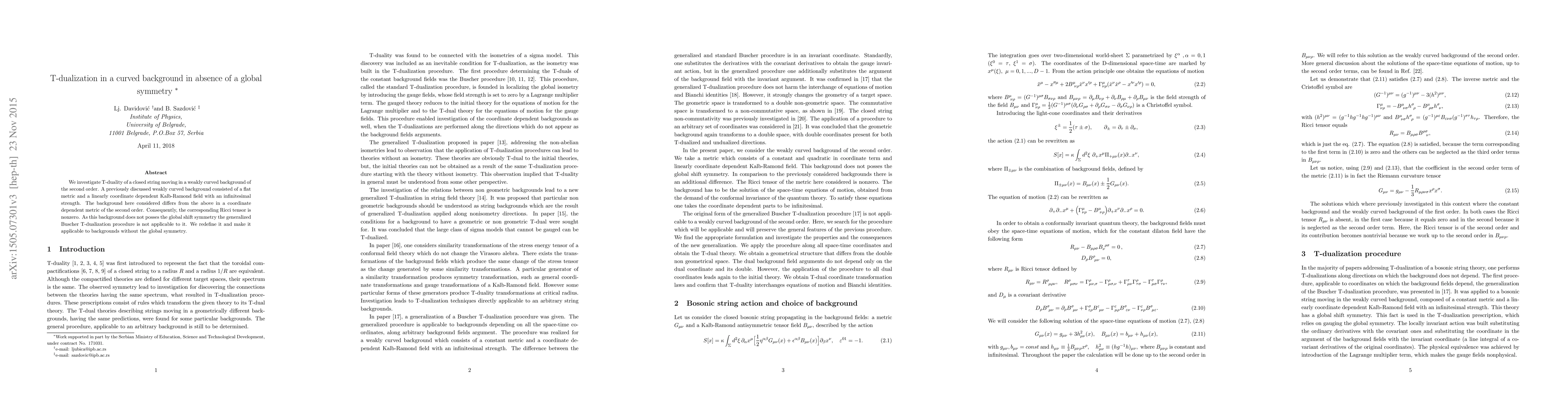 This paper explores T-duality for a closed string in a weakly curved background with a second-order coordinate-dependent metric, where the Ricci tensor is nonzero. Traditional Buscher T-dualization fails due to the absence of a global symmetry, prompting a redefinition of the procedure to accommodate such backgrounds.