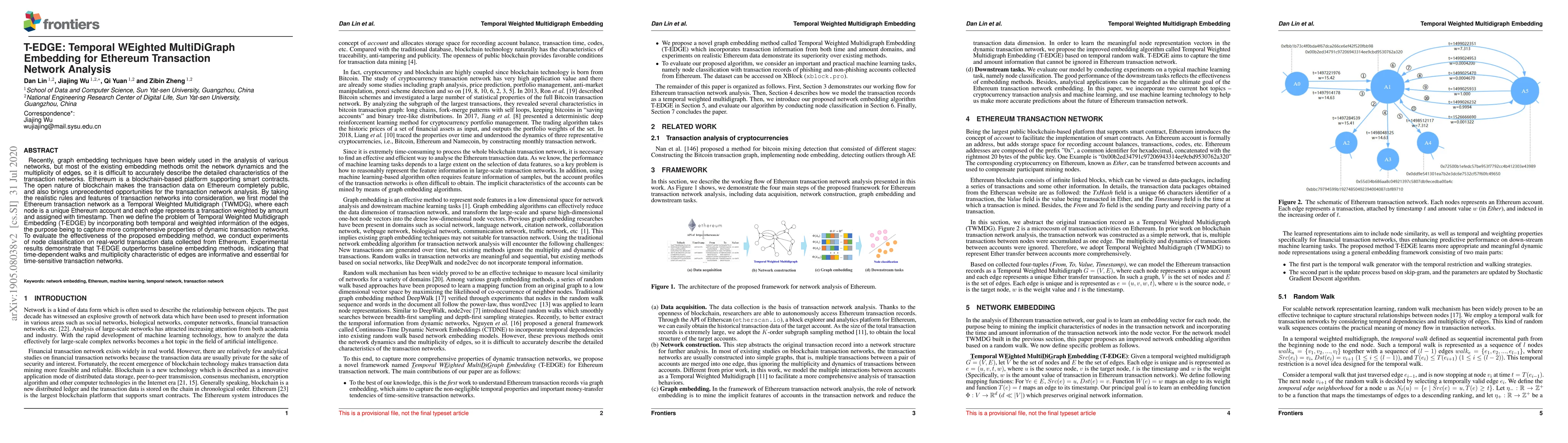 The paper proposes T-EDGE, a Temporal WEighted MultiDiGraph Embedding method to model Ethereum transaction networks as Temporal Weighted Multidigraphs, capturing temporal and weighted edge details for comprehensive network analysis. Experiments show T-EDGE outperforms baseline methods in node classification, indicating the importance of temporal and edge multiplicity in dynamic transaction networks.