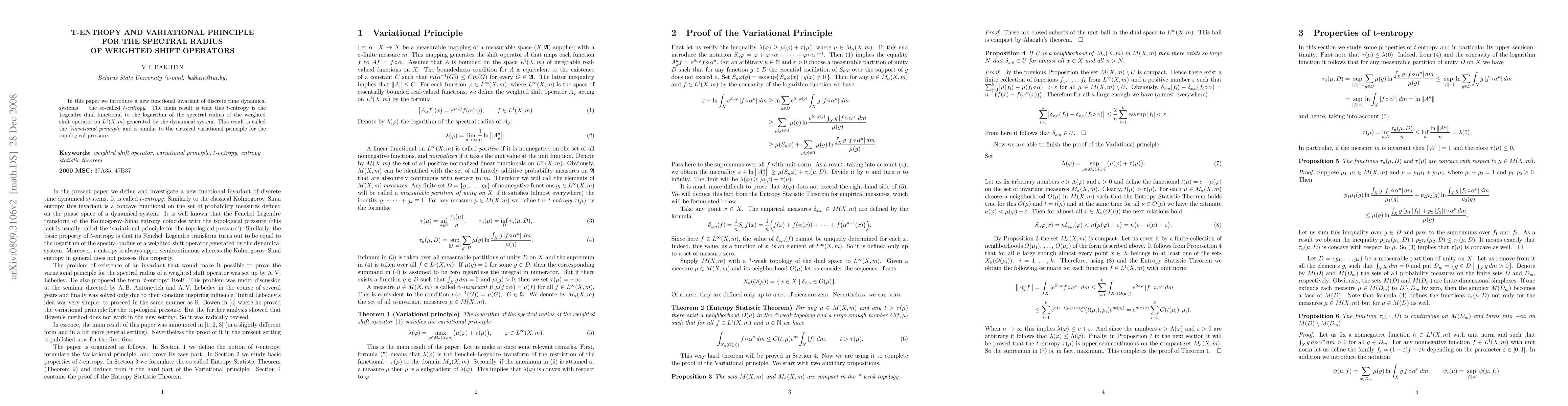 This paper introduces a new functional, t-entropy, for discrete time dynamical systems, establishing it as the Legendre dual to the logarithm of the spectral radius of weighted shift operators. The main result is a variational principle linking t-entropy to the spectral radius, analogous to the classical variational principle for topological pressure.