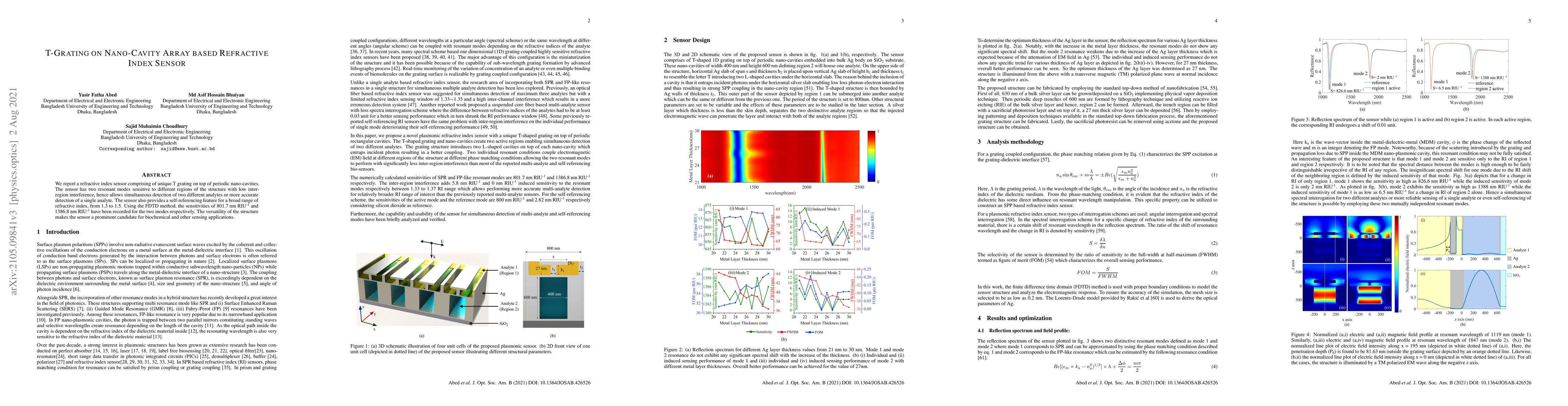 We report a refractive index sensor comprising of unique T grating on top of periodic nano-cavities. The sensor has two resonant modes sensitive to different regions of the structure with low inter-region interference, hence allows simultaneous detection of two different analytes or more accurate detection of a single analyte. The sensor also provides a self-referencing feature for a broad range of refractive index, from 1.3 to 1.5. Using the FDTD method, the sensitivities of 801.7 nm/RIU and 1386.8 nm/RIU have been recorded for the two modes respectively. The versatility of the structure makes the sensor a prominent candidate for biochemical and other sensing applications.