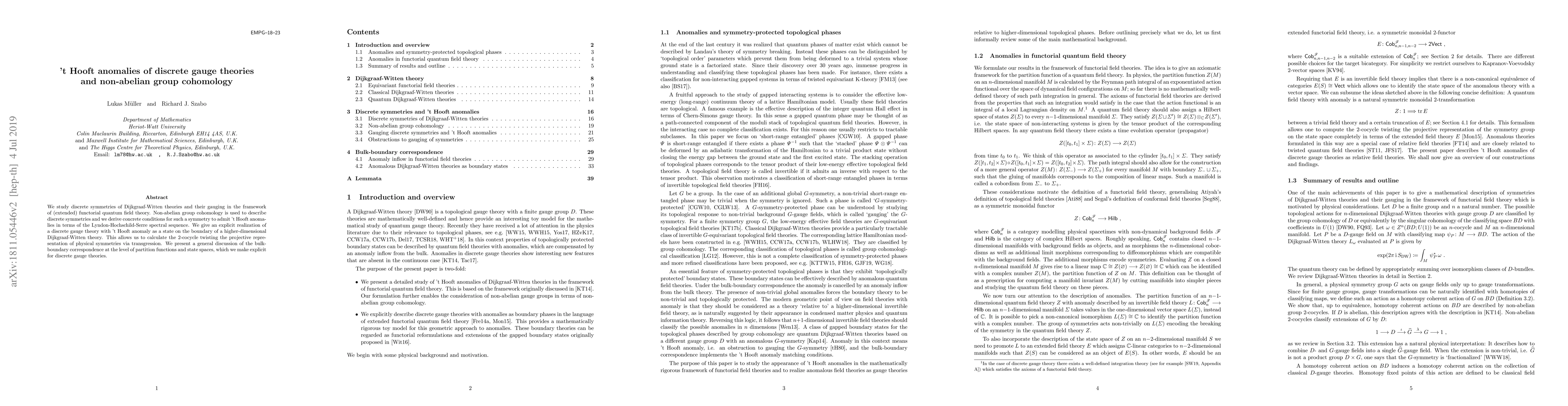We study discrete symmetries of Dijkgraaf-Witten theories and their gauging in the framework of (extended) functorial quantum field theory. Non-abelian group cohomology is used to describe discrete symmetries and we derive concrete conditions for such a symmetry to admit 't Hooft anomalies in terms of the Lyndon-Hochschild-Serre spectral sequence. We give an explicit realization of a discrete gauge theory with 't Hooft anomaly as a state on the boundary of a higher-dimensional Dijkgraaf-Witten theory. This allows us to calculate the 2-cocycle twisting the projective representation of physical symmetries via transgression. We present a general discussion of the bulk-boundary correspondence at the level of partition functions and state spaces, which we make explicit for discrete gauge theories.