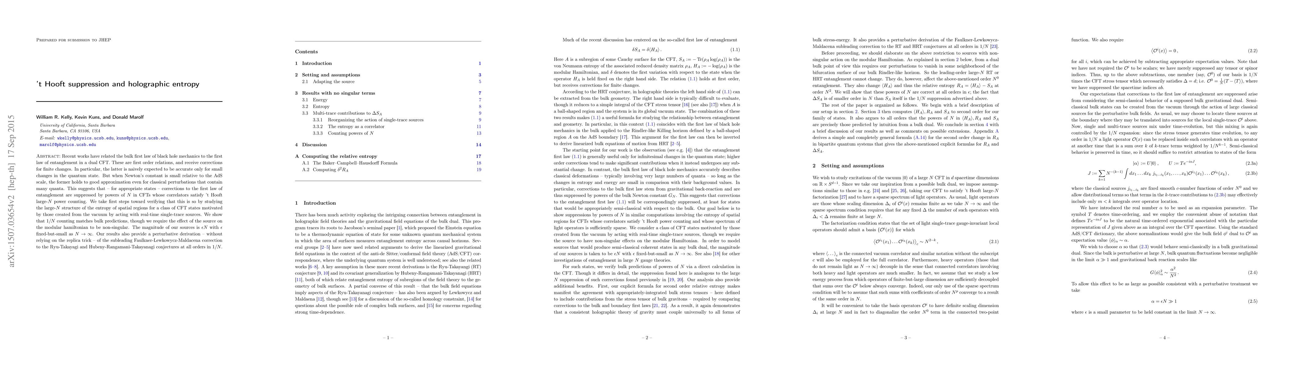 This paper explores the relationship between the first law of black hole mechanics and entanglement in dual CFTs, showing that 't Hooft suppression leads to corrections to the first law of entanglement being suppressed by powers of $N$ in large-$N$ CFTs. It provides a perturbative derivation of the subleading correction to the Ryu-Takayagi formula without using the replica trick, confirming $1/N$ counting matches bulk predictions.