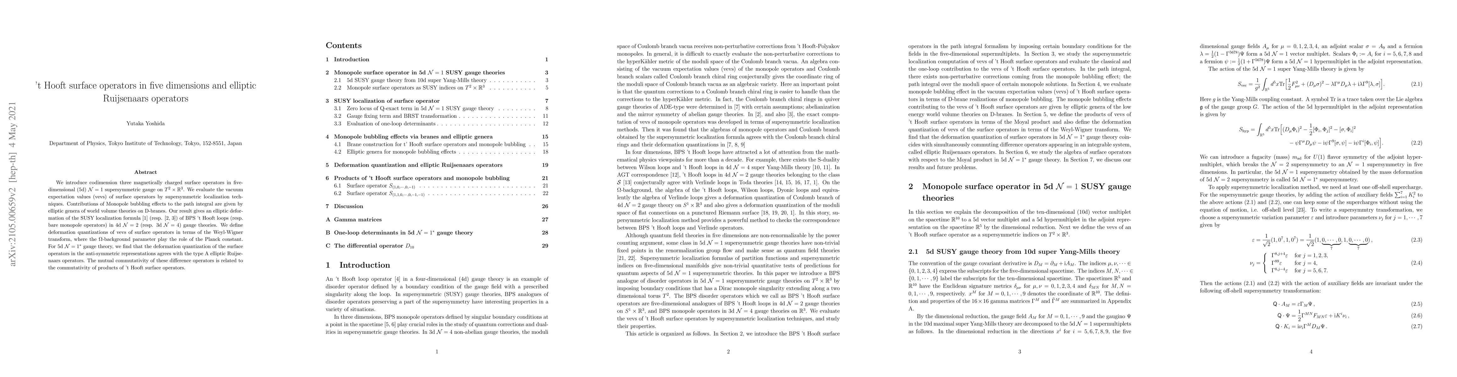 This research introduces codimension three surface operators in 5d $mathcal{N}=1$ supersymmetric gauge theory, evaluating their vacuum expectation values via supersymmetric localization. Elliptic genera of worldvolume theories on D-branes describe Monopole bubbling effects, leading to an elliptic deformation of 4d $mathcal{N}=2$ and 3d $mathcal{N}=4$ BPS 't Hooft loop/monopole operator localization formulas. Deformation quantization of surface operator vevs is established using the Weyl-Wigner transform, linking 5d $mathcal{N}=1^*$ gauge theory surface operators in anti-symmetric representations to type A elliptic Ruijsenaars operators, with mutual commutativity of these operators tied to 't Hooft surface operator product commutativity.
