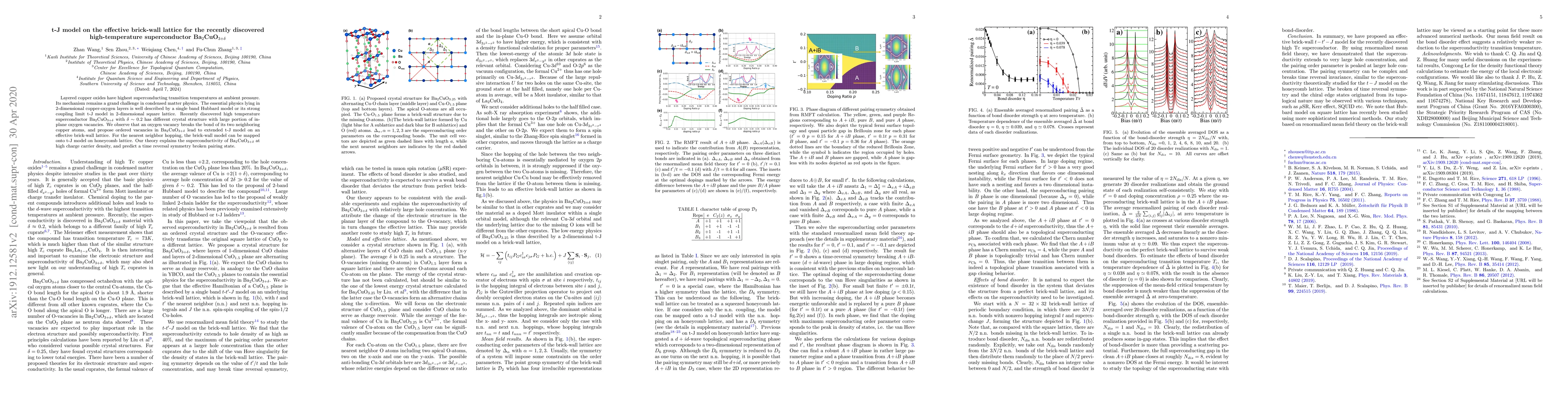 This paper proposes an extended t-J model on a brick-wall lattice to describe the superconductivity in the high-temperature superconductor Ba$_2$CuO$_{3+\delta}$, attributing the superconductivity to ordered oxygen vacancies that create a unique lattice structure. The model predicts a time reversal symmetry broken pairing state at high charge carrier density.