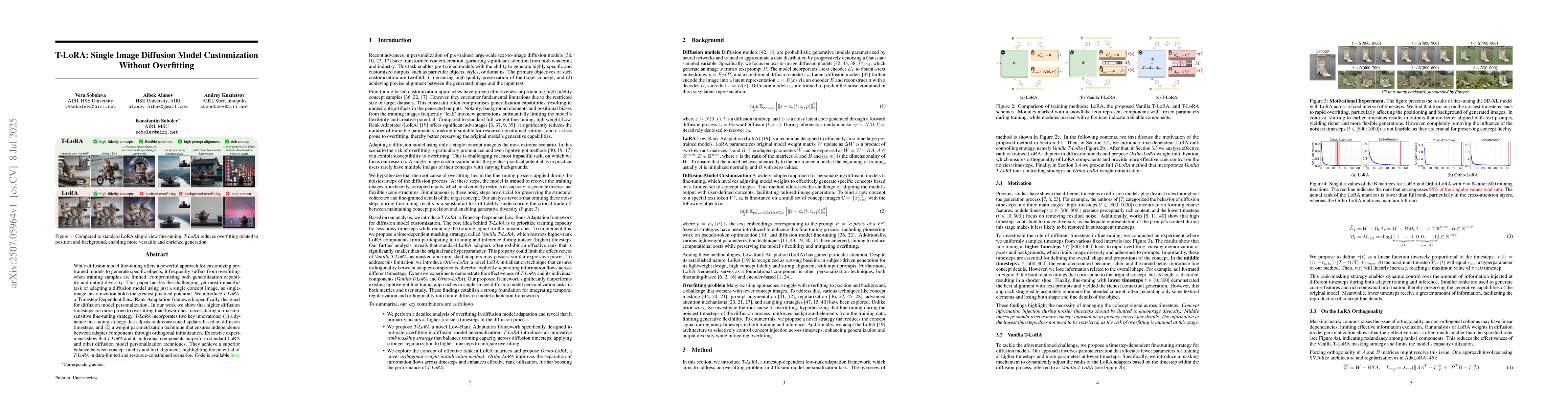 While diffusion model fine-tuning offers a powerful approach for customizing pre-trained models to generate specific objects, it frequently suffers from overfitting when training samples are limited, compromising both generalization capability and output diversity. This paper tackles the challenging yet most impactful task of adapting a diffusion model using just a single concept image, as single-image customization holds the greatest practical potential. We introduce T-LoRA, a Timestep-Dependent Low-Rank Adaptation framework specifically designed for diffusion model personalization. In our work we show that higher diffusion timesteps are more prone to overfitting than lower ones, necessitating a timestep-sensitive fine-tuning strategy. T-LoRA incorporates two key innovations: (1) a dynamic fine-tuning strategy that adjusts rank-constrained updates based on diffusion timesteps, and (2) a weight parametrization technique that ensures independence between adapter components through orthogonal initialization. Extensive experiments show that T-LoRA and its individual components outperform standard LoRA and other diffusion model personalization techniques. They achieve a superior balance between concept fidelity and text alignment, highlighting the potential of T-LoRA in data-limited and resource-constrained scenarios. Code is available at https://github.com/ControlGenAI/T-LoRA.