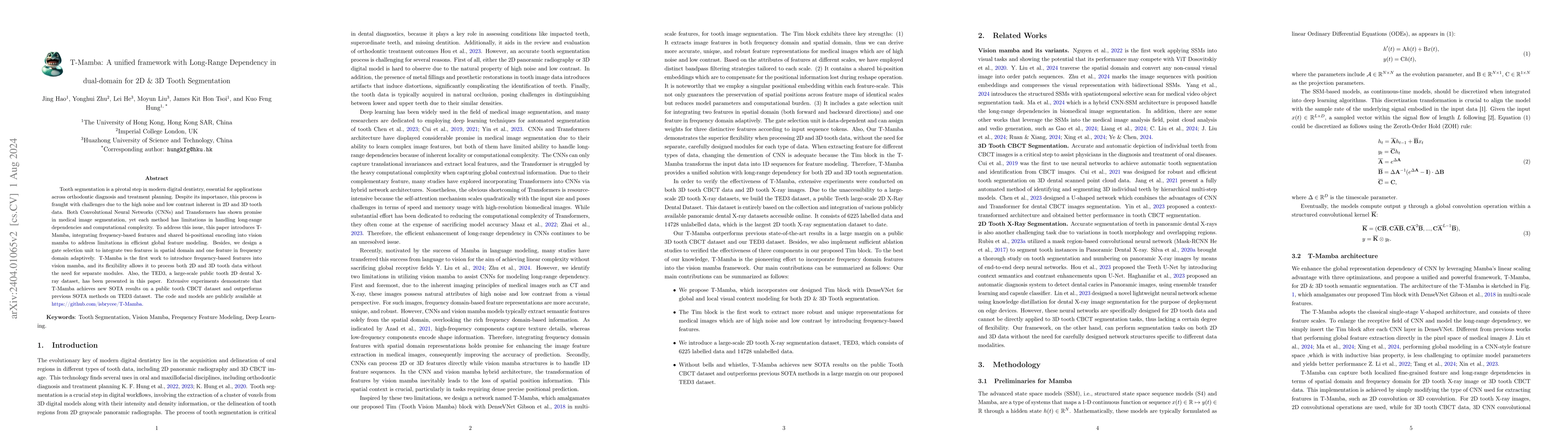 T-Mamba integrates frequency-based features and gated long-range dependencies into a vision mamba model for improved 3D tooth segmentation in CBCT images, achieving superior performance over previous methods. The model demonstrates significant improvements in metrics such as Intersection over Union (IoU), Surface Overlapping (SO), Dice Similarity Coefficient (DSC), Hausdorff Distance (HD), and Average Surface Distance Symmetric (ASSD).