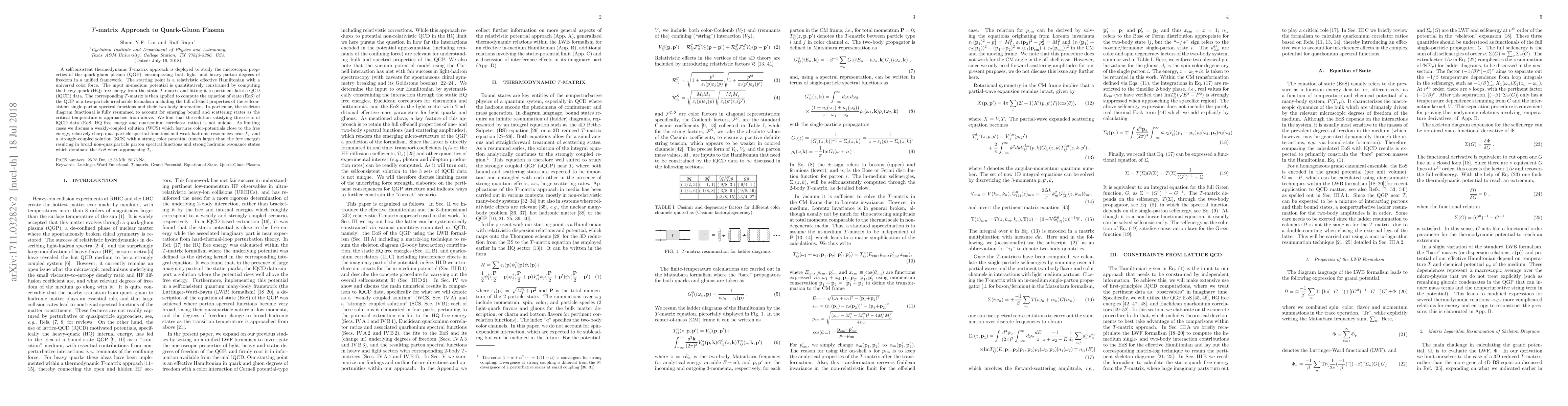 A selfconsistent thermodynamic $T$-matrix approach is deployed to study the microscopic properties of the quark-gluon plasma (QGP), encompassing both light- and heavy-parton degrees of freedom in a unified framework. The starting point is a relativistic effective Hamiltonian with a universal color force. The input in-medium potential is quantitatively constrained by computing the heavy-quark (HQ) free energy from the static $T$-matrix and fitting it to pertinent lattice-QCD (lQCD) data. The corresponding $T$-matrix is then applied to compute the equation of state (EoS) of the QGP in a two-particle irreducible formalism including the full off-shell properties of the selfconsistent single-parton spectral functions and their two-body interaction. In particular, the skeleton diagram functional is fully resummed to account for emerging bound and scattering states as the critical temperature is approached from above. We find that the solution satisfying three sets of lQCD data (EoS, HQ free energy and quarkonium correlator ratios) is not unique. As limiting cases we discuss a weakly-coupled solution (WCS) which features color-potentials close to the free energy, relatively sharp quasiparticle spectral functions and weak hadronic resonances near $T_{\rm c}$, and a strongly-coupled solution (SCS) with a strong color potential (much larger than the free energy) resulting in broad non-quasiparticle parton spectral functions and strong hadronic resonance states which dominate the EoS when approaching $T_{\rm c}$.