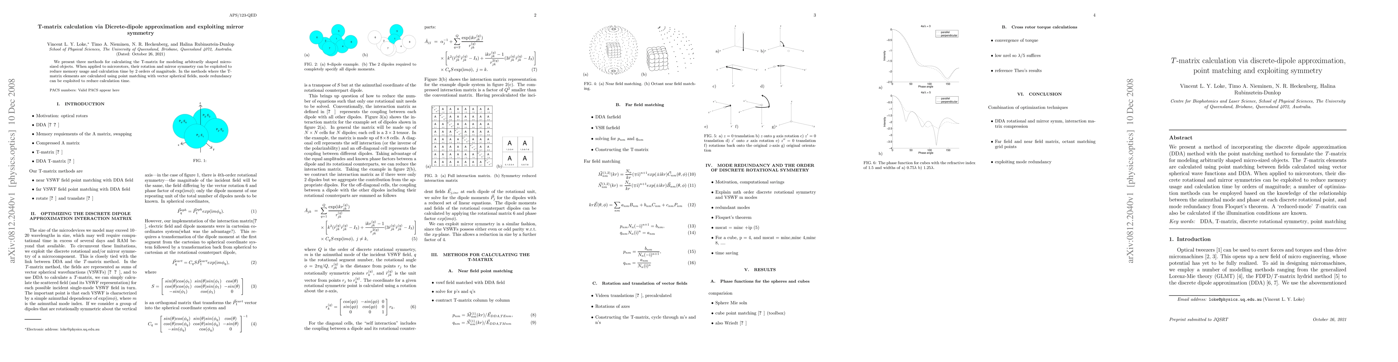 This paper introduces a method combining the discrete dipole approximation (DDA) with the point matching method to compute the T-matrix for modeling micro-sized objects. It leverages symmetries in microrotors to optimize memory usage and calculation time significantly.