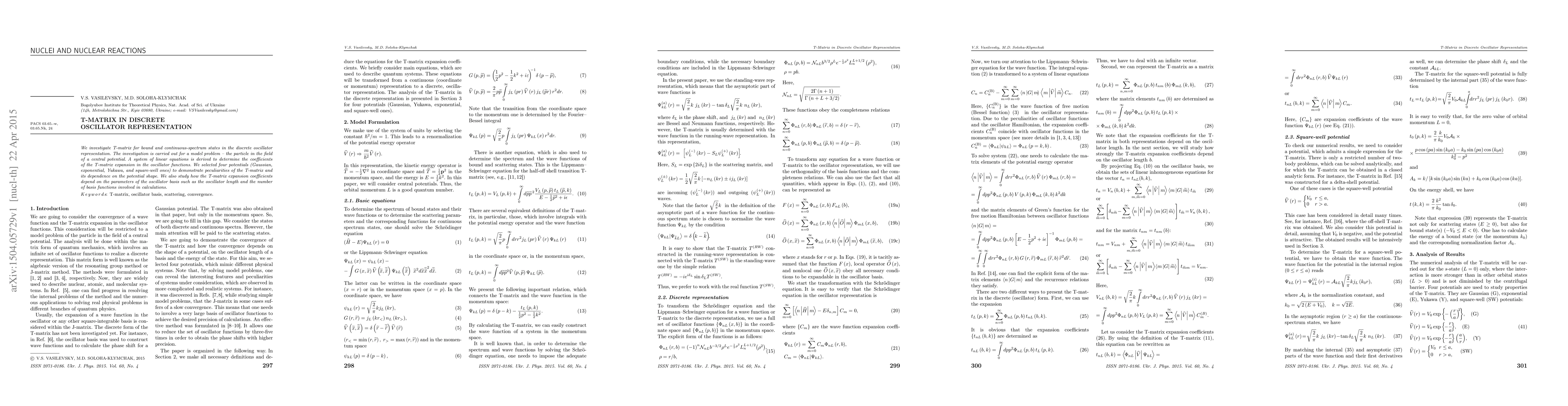 This paper explores the T-matrix for both bound and continuous-spectrum states using a discrete oscillator representation, focusing on a central potential model. It derives linear equations to determine T-matrix coefficients in oscillator functions and examines four potentials to highlight the T-matrix's dependence on potential shape and oscillator parameters.