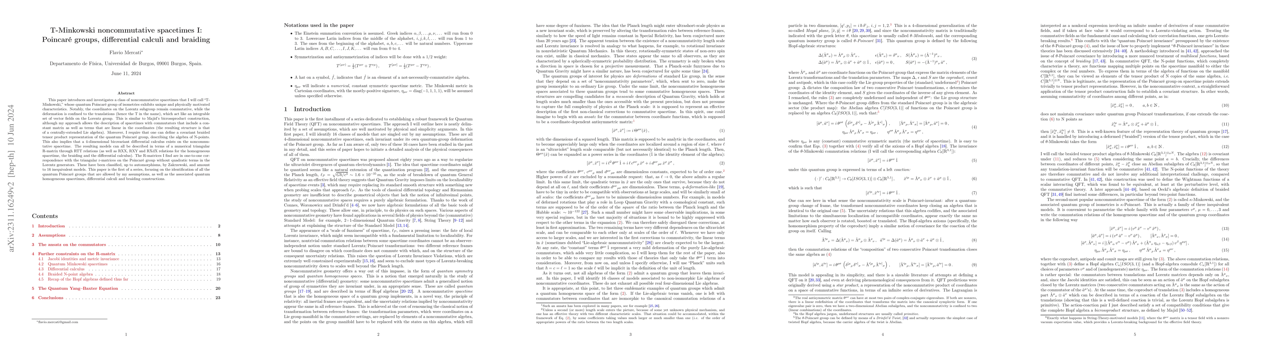 This paper introduces "T-Minkowski" noncommutative spacetimes, where translations are deformed while Lorentz coordinates remain commutative. It explores the quantum Poincaré group, differential calculi, and braiding, revealing 16 inequivalent models via numerical triangular R-matrices.