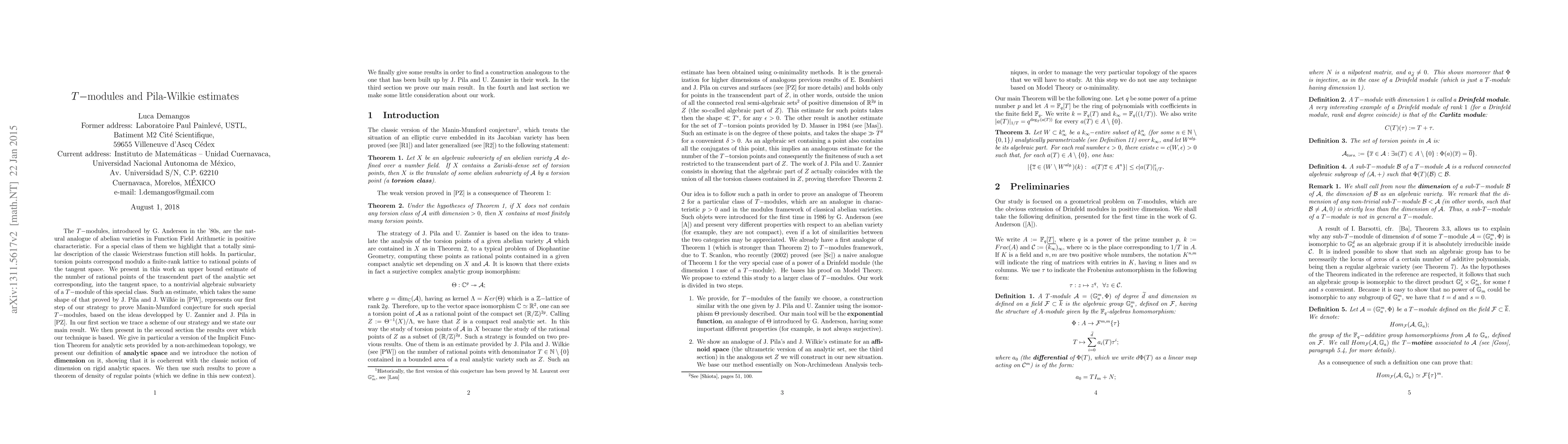 Researchers study $T-$modules in positive characteristic, finding a connection to Manin-Mumford conjecture, and establish an upper bound estimate for the number of rational points on a related set.