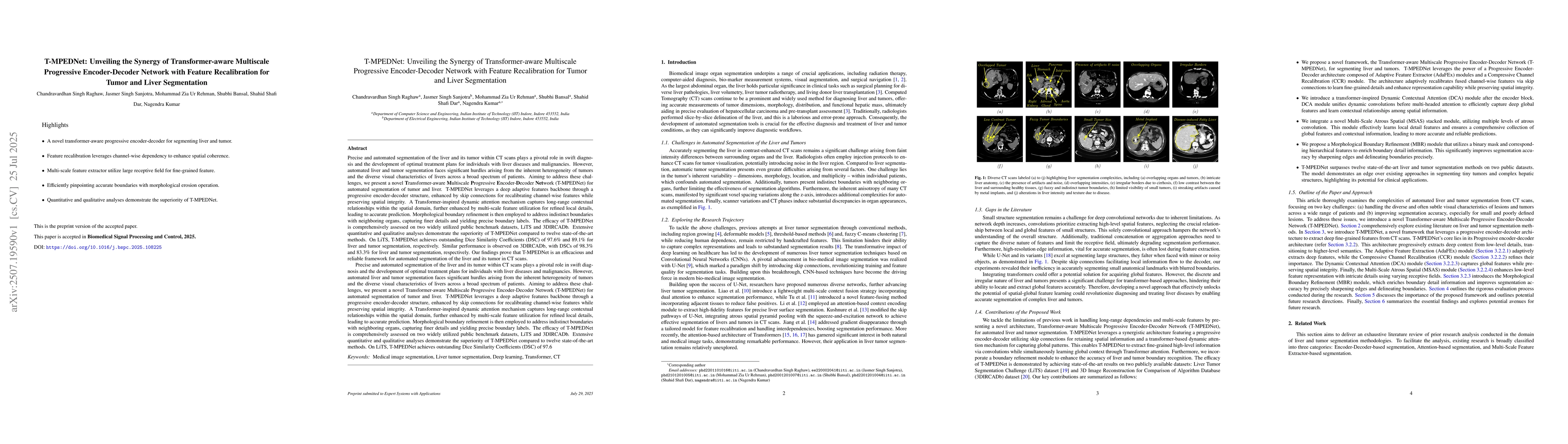 Precise and automated segmentation of the liver and its tumor within CT scans plays a pivotal role in swift diagnosis and the development of optimal treatment plans for individuals with liver diseases and malignancies. However, automated liver and tumor segmentation faces significant hurdles arising from the inherent heterogeneity of tumors and the diverse visual characteristics of livers across a broad spectrum of patients. Aiming to address these challenges, we present a novel Transformer-aware Multiscale Progressive Encoder-Decoder Network (T-MPEDNet) for automated segmentation of tumor and liver. T-MPEDNet leverages a deep adaptive features backbone through a progressive encoder-decoder structure, enhanced by skip connections for recalibrating channel-wise features while preserving spatial integrity. A Transformer-inspired dynamic attention mechanism captures long-range contextual relationships within the spatial domain, further enhanced by multi-scale feature utilization for refined local details, leading to accurate prediction. Morphological boundary refinement is then employed to address indistinct boundaries with neighboring organs, capturing finer details and yielding precise boundary labels. The efficacy of T-MPEDNet is comprehensively assessed on two widely utilized public benchmark datasets, LiTS and 3DIRCADb. Extensive quantitative and qualitative analyses demonstrate the superiority of T-MPEDNet compared to twelve state-of-the-art methods. On LiTS, T-MPEDNet achieves outstanding Dice Similarity Coefficients (DSC) of 97.6% and 89.1% for liver and tumor segmentation, respectively. Similar performance is observed on 3DIRCADb, with DSCs of 98.3% and 83.3% for liver and tumor segmentation, respectively. Our findings prove that T-MPEDNet is an efficacious and reliable framework for automated segmentation of the liver and its tumor in CT scans.