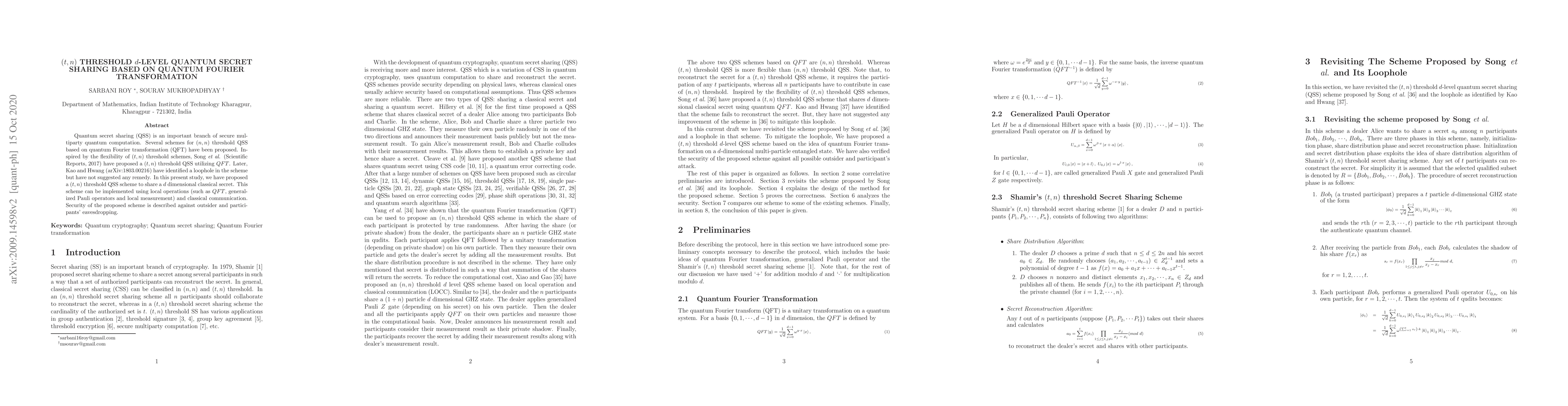 Researchers have developed a quantum secret sharing scheme that allows for $d$-dimensional classical secrets to be shared among multiple parties with a threshold of $(t, n)$ levels using local operations and classical communication. The scheme has been shown to be secure against eavesdropping by outsiders and malicious participants.