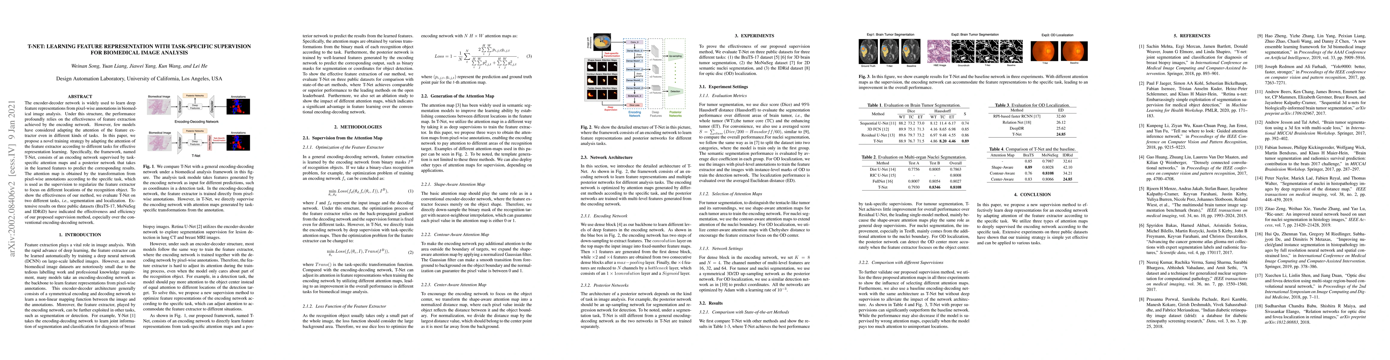 The encoder-decoder network is widely used to learn deep feature representations from pixel-wise annotations in biomedical image analysis. Under this structure, the performance profoundly relies on the effectiveness of feature extraction achieved by the encoding network. However, few models have considered adapting the attention of the feature extractor even in different kinds of tasks. In this paper, we propose a novel training strategy by adapting the attention of the feature extractor according to different tasks for effective representation learning. Specifically, the framework, named T-Net, consists of an encoding network supervised by task-specific attention maps and a posterior network that takes in the learned features to predict the corresponding results. The attention map is obtained by the transformation from pixel-wise annotations according to the specific task, which is used as the supervision to regularize the feature extractor to focus on different locations of the recognition object. To show the effectiveness of our method, we evaluate T-Net on two different tasks, i.e. , segmentation and localization. Extensive results on three public datasets (BraTS-17, MoNuSeg and IDRiD) have indicated the effectiveness and efficiency of our proposed supervision method, especially over the conventional encoding-decoding network.