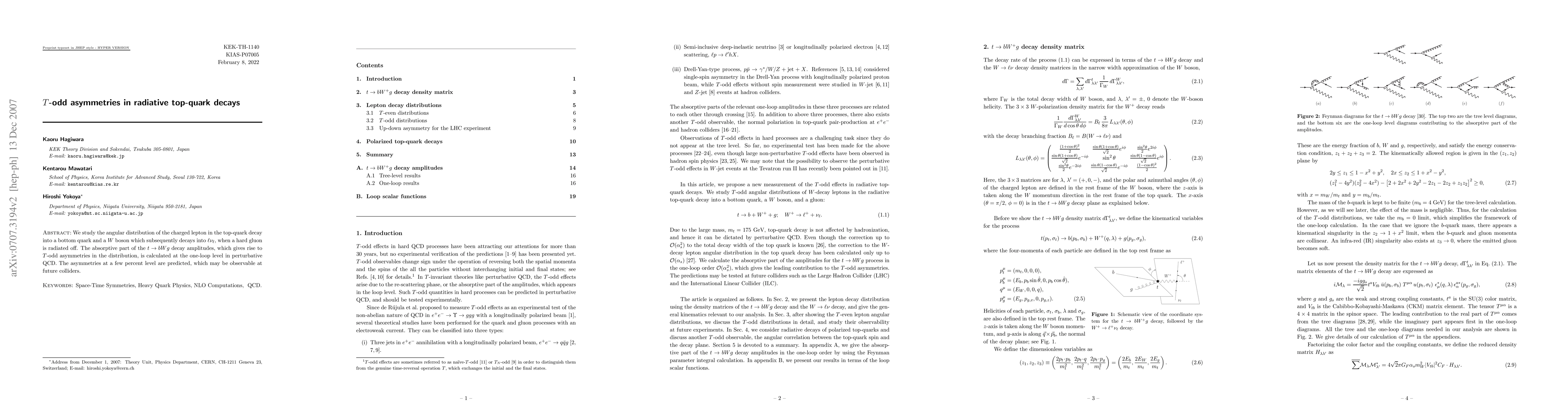 This paper investigates T-odd asymmetries in radiative top-quark decays, calculating the absorptive part of the t → bWg decay amplitudes at the one-loop level in perturbative QCD. Predicted asymmetries at the few percent level may be observable at future collider experiments.