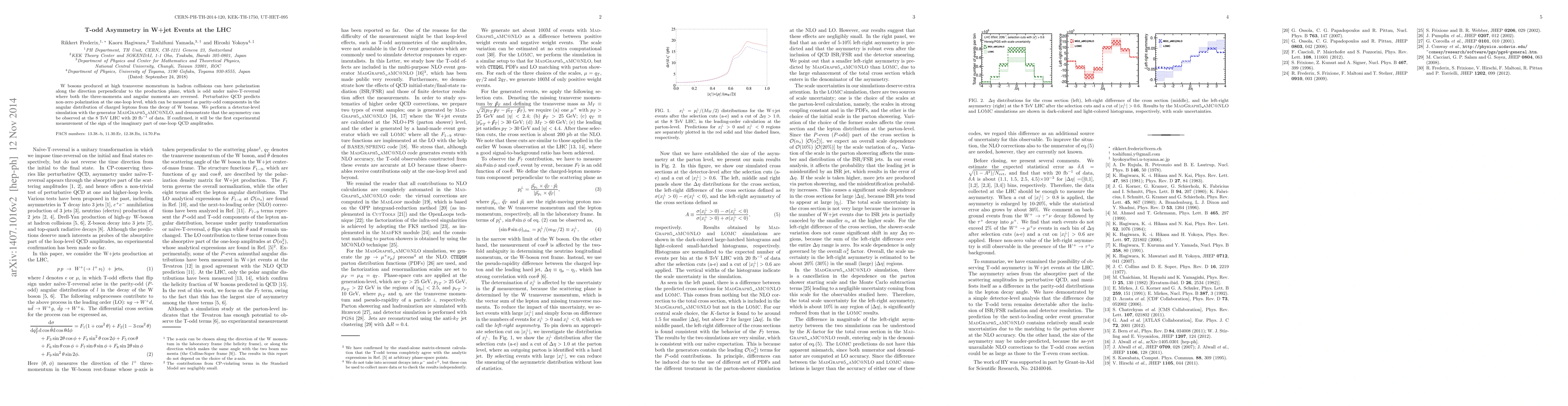 W bosons produced at high transverse momentum in hadron collisions can have polarization along the direction perpendicular to the production plane, which is odd under na$\ddot{\i}$ve-T-reversal where both the three-momenta and angular momenta are reversed. Perturbative QCD predicts non-zero polarization at the one-loop level, which can be measured as parity-odd components in the angular distribution of charged leptons from the decay of W bosons. We perform a detector-level simulation with the generator MadGraph5_aMC@NLO, and demonstrate that the asymmetry can be observed at the 8 TeV LHC with 20 fb$^{-1}$ of data. If confirmed, it will be the first experimental measurement of the sign of the imaginary part of one-loop QCD amplitudes.
