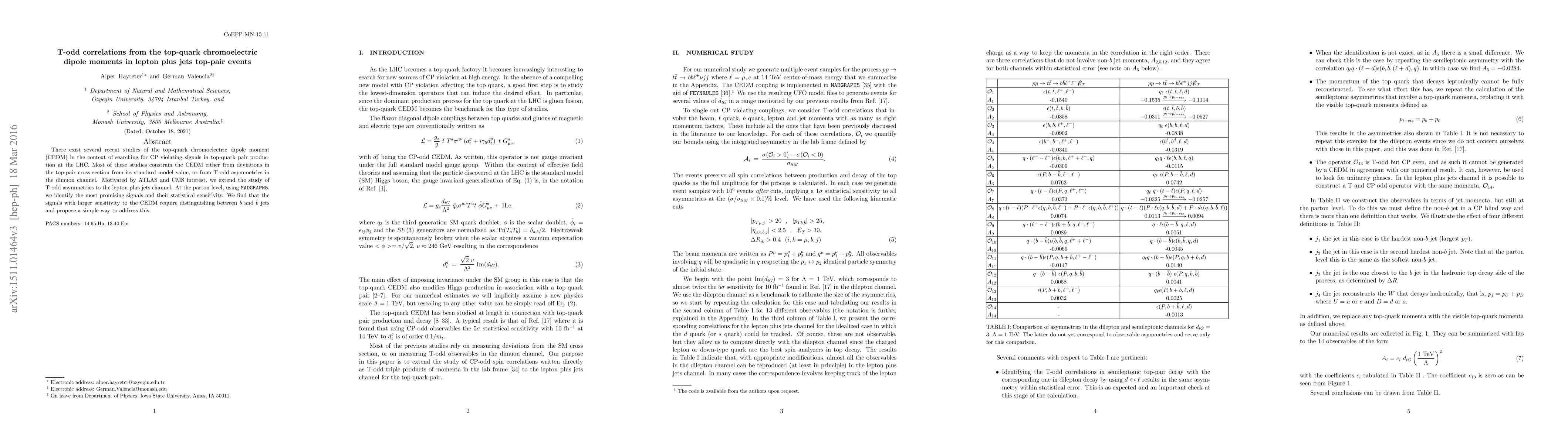 There exist several recent studies of the top-quark CEDM in the context of searching for CP violating signals in top-quark pair production at the LHC. Most of these studies constrain the CEDM either from deviations in the top-pair cross section from its standard model value, or from T-odd asymmetries in the dimuon channel. Motivated by ATLAS and CMS interest, we extend the study of T-odd asymmetries to the lepton plus jets channel. At the parton level, using MadGraph, we identify the most promising signals and their statistical sensitivity. We find that the signals with larger sensitivity to the CEDM require distinguishing between $b$ and $\bar{b}$ jets and propose a simple way to address this.