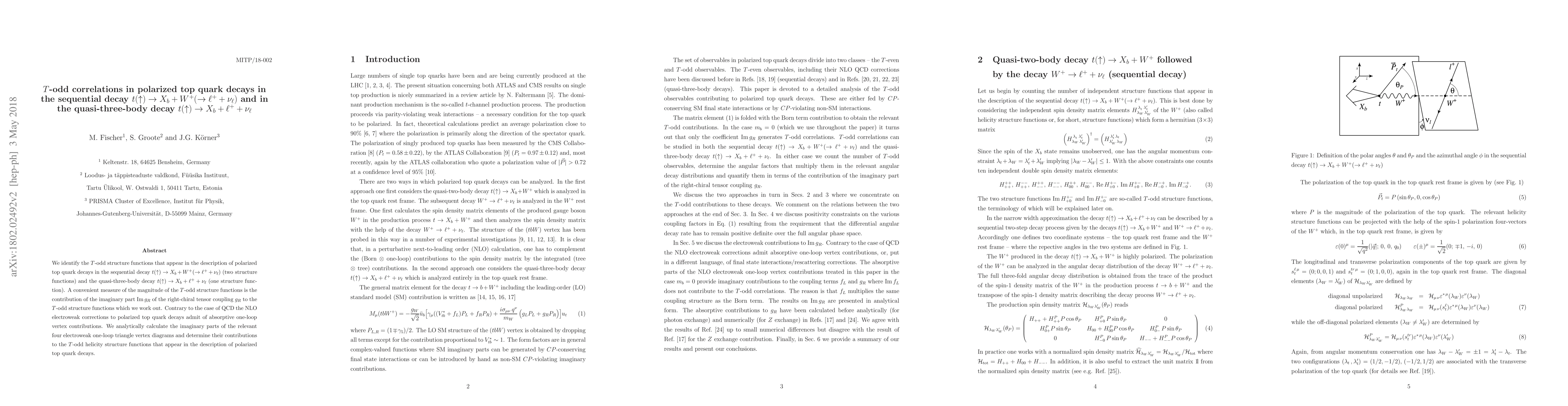 This paper identifies $T$-odd structure functions in polarized top quark decays for two sequential decay processes and calculates their magnitudes, focusing on the imaginary part of the right-chiral tensor coupling. It also determines the contributions from electroweak one-loop vertex corrections to these $T$-odd structure functions.